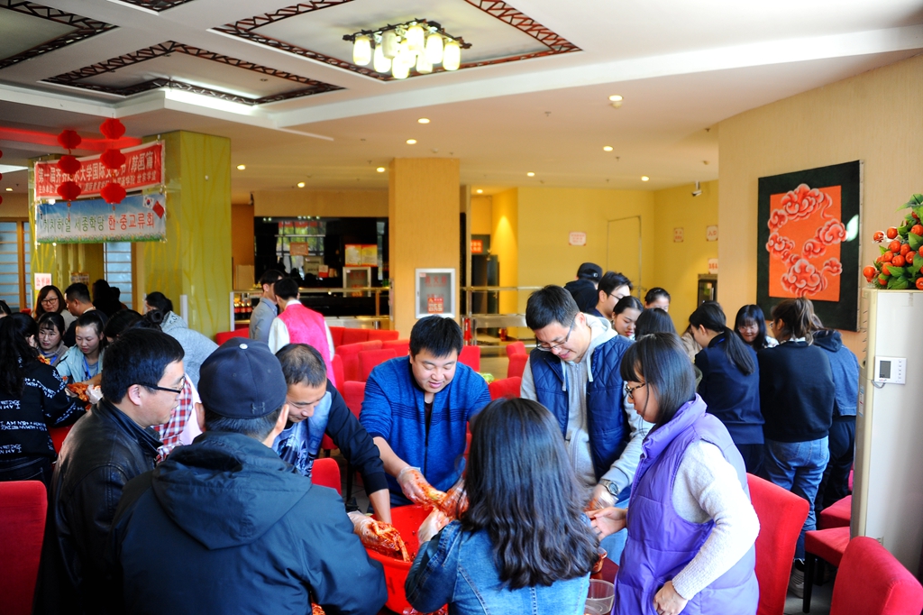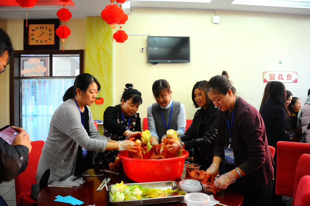 此次活动以韩国传统美食“泡菜”为主题,由韩国教师详细讲解演示泡菜的制作过程。师生们亲自动手制作泡菜,并与打糕等韩国传统美食一起品尝,活动现场气氛热烈。