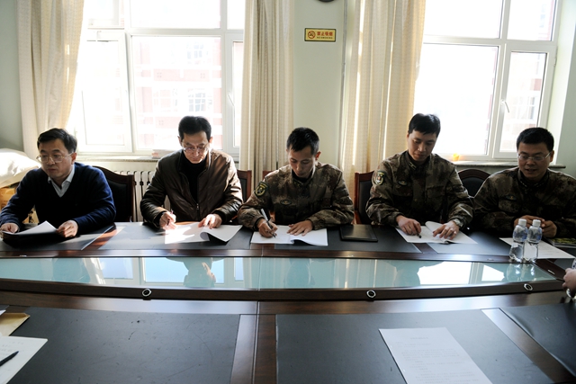 会议上,中国人民解放军65448部队政治处主任姜殿舟与我校武装部部长吴刚代表军校双方签署了军校共建协议。