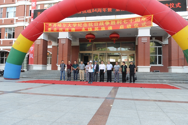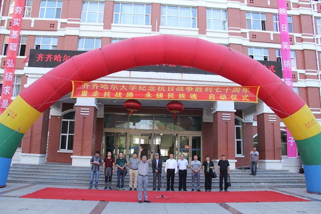 校党委书记李海红在启动仪式上讲话。他说,今天,我们在这里举行一个隆重而庄严的仪式,为齐齐哈尔大学“重走抗战路”的百名师生出征壮行。同学们将沿着爱国将军马占山当年出征抗战的行军路线,步行到达打响中国军队武装抗日第一枪的地方——泰来县江桥镇,并以此纪念70年前那场伟大的民族胜利。