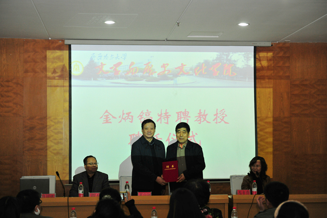 5月15日下午,我校在西主学术报告厅举行了金炳镐特聘教授聘任仪式。市委宣传部副部长覃华,市民族宗教事务局副局长李光玉,市民族宗教事务局正局级调研员周汉武,齐齐哈尔市达斡尔族学会会长、民族中学校长高春梅,齐齐哈尔市蒙古族联合会会长、民族中学党支部书记王景元,齐齐哈尔市回族联合会原会长王守维,我校党委书记李海红,校党委常委、副校长邓启刚,校党委宣传统战部部长、社科处处长王晓梅,人事处处长张文治,美术与设计学院院长马振庆,音乐与舞蹈学院院长孙相根,文学与历史文化学院党委书记张振民、副院长肖国栋、吴丽华,以及来自各学院的师生和齐齐哈尔地区致力于少数民族文化研究方面的专家学者。聘任仪式由文学与历史文化学院副院长肖国栋教授主持。