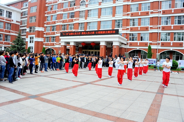 仪式上,我校教育与传媒学院的学生表演了心理健康操,体育学院学生表演了广场舞,展示了我校大学生阳光自信、充满活力的良好形象,在现场观众中引起强烈反响和共鸣。