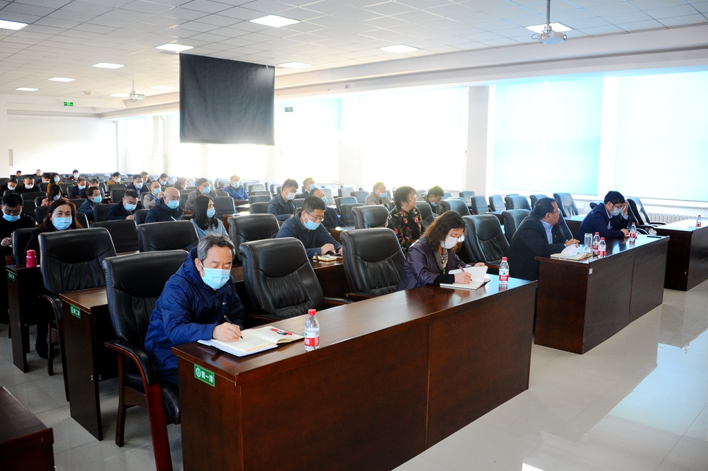 我校校长董玉庭、校党委副书记齐宏伟、校党委副书记张文治、副校长吕厚均和相关职能部门负责人、各二级教学单位党政主要负责人在求实楼5楼会议室通过视频会议的方式参会。