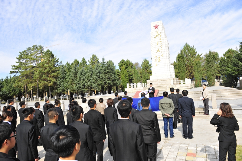 为庆祝建国65周年,缅怀烈士功绩,弘扬烈士精神,践行社会主义核心价值观,在第一个烈士纪念日到来之际,我校机关党委、校团委组织师生代表50人来到西满革命烈士陵园,深切缅怀革命先烈的丰功伟绩,告慰他们的在天之灵。校党委宣传部、统战部副部长孟宪国、文学与历史文化学院副院长肖国栋、校团委副书记迟生茂等与青年教师党员代表、来自各学生组织的青年学生代表参加了本次祭扫、献花活动。校团委副书记苏醒主持了祭扫献花仪式,并宣布:“‘缅怀革命先烈,弘扬中国精神’祭扫暨践行核心价值观第四次集体学习活动正式开始!”