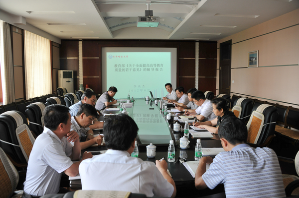 二是《意见》的主要内容。副校长李英杰阐述了《意见》的主要内容:即一个根本点、一项核心任务、四类协同创新模式和八方面体制、机制改革。《意见》分七大部分三十条,分别介绍了坚持内涵式发展、促进高校办出特色、完善人才培养质量标准体系、优化学科专业和人才培养结构、创新人才培养模式、巩固本科教学基础地位、改革研究生培养机制、强化实践育人环节、加强创新创业教育和就业指导服务、加强和改进思想政治教育、健全教育质量评估制度、推进协同创新、提升高校科技创新能力等方面的内容。