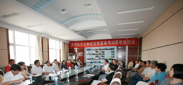 会场正中悬挂着“齐齐哈尔大学纪念恢复高考30周年座谈会”的横幅,横幅下方悬挂着由宣传部精心制作的大型喷绘图片,50多张珍贵的历史老照片构成一个“30”图案,展示着77级同学入学至今30年来学校发展变化的辉煌历程。