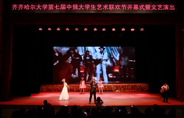 第七届中俄大学生艺术联欢节开幕式暨文艺演出在齐齐哈尔大学民族管弦乐团指挥陈曦泽执棒的民族管弦乐合奏《我的祖国》中拉开帷幕,来自俄罗斯东西伯利亚国立文化艺术大学、后贝加尔国立大学的学生以及黑龙江大学、齐齐哈尔医学院的留学生和我校国际教育学院的留学生、音乐与舞蹈学院的学生一起载歌载舞,联欢联谊。