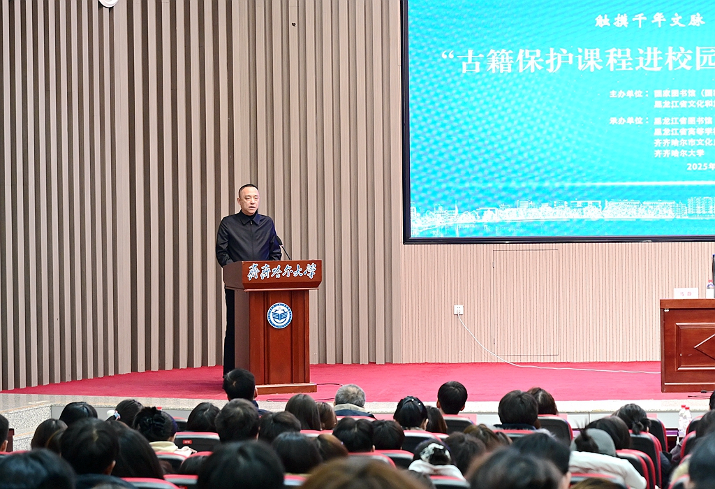 黑水琳琅映鹤城,寒域遗珠绽芳华。10月29日,全省公共图书馆领导及我校师生代表400余人齐聚日新大厦,共同参与黑龙江省“触摸千年文脉,赓续文明薪火——古籍保护课程进校园”齐齐哈尔大学专场活动。活动由国家图书馆(国家古籍保护中心)、黑龙江省文化和旅游厅主办,黑龙江省图书馆(黑龙江省古籍保护中心)、黑龙江省高等学校图书情报工作委员会、齐齐哈尔市文化广电和旅游局、齐齐哈尔大学承办。