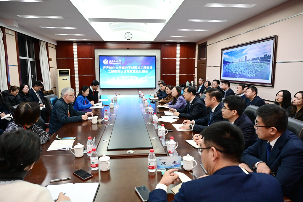 校长郝文斌代表学校对专家组的悉心指导和辛勤付出表示衷心感谢,并作表态发言。他指出,专家组的意见精准深刻、中肯客观,为学校深化工科专业内涵建设、提升工程教育质量指明了方向。学校对专家组反馈的意见和建议诚恳接受、照单全收、坚决整改、全面落实,下一步将主要从以下三个方面抓实落靠。一是加强组织领导,全面压实认证整改责任。学校将立即成立整改工作领导小组,统筹推进高分子材料与工程专业认证整改工作,列出工作台账,建立“问题清单、任务清单、责任清单、时限清单”,形成“学校统筹、部门协同、学院主抓、专业落实”四级责任链条,确保各项整改工作落地见效。二是坚持问题导向,落实落靠整改工作任务。学校将认真整改工作纳入学校重点日程,对照工程教育专业认证标准,深化人才培养改革,优化师资队伍建设,强化生产实习、毕业实习等实践环节保障,健全质量保障体系,以务实举措推动专业建设提质增效。三是以认证为契机,全面加强学校工科专业建设。学校进一步深化工程教育理念,运用人工智能赋能人才培养模式改革、课程体系优化、实践教学创新,以认证促改革、以认证促创新、以认证促建设,带动学校工科专业整体发展。同时,紧扣黑龙江省及齐齐哈尔市装备制造、新材料等重点产业需求,加大产教融合、科教融汇,共建一批校企联合实验室、实习实训基地,为区域经济社会高质量发展培养更多学以致用、会学善用的高素质应用型人才。