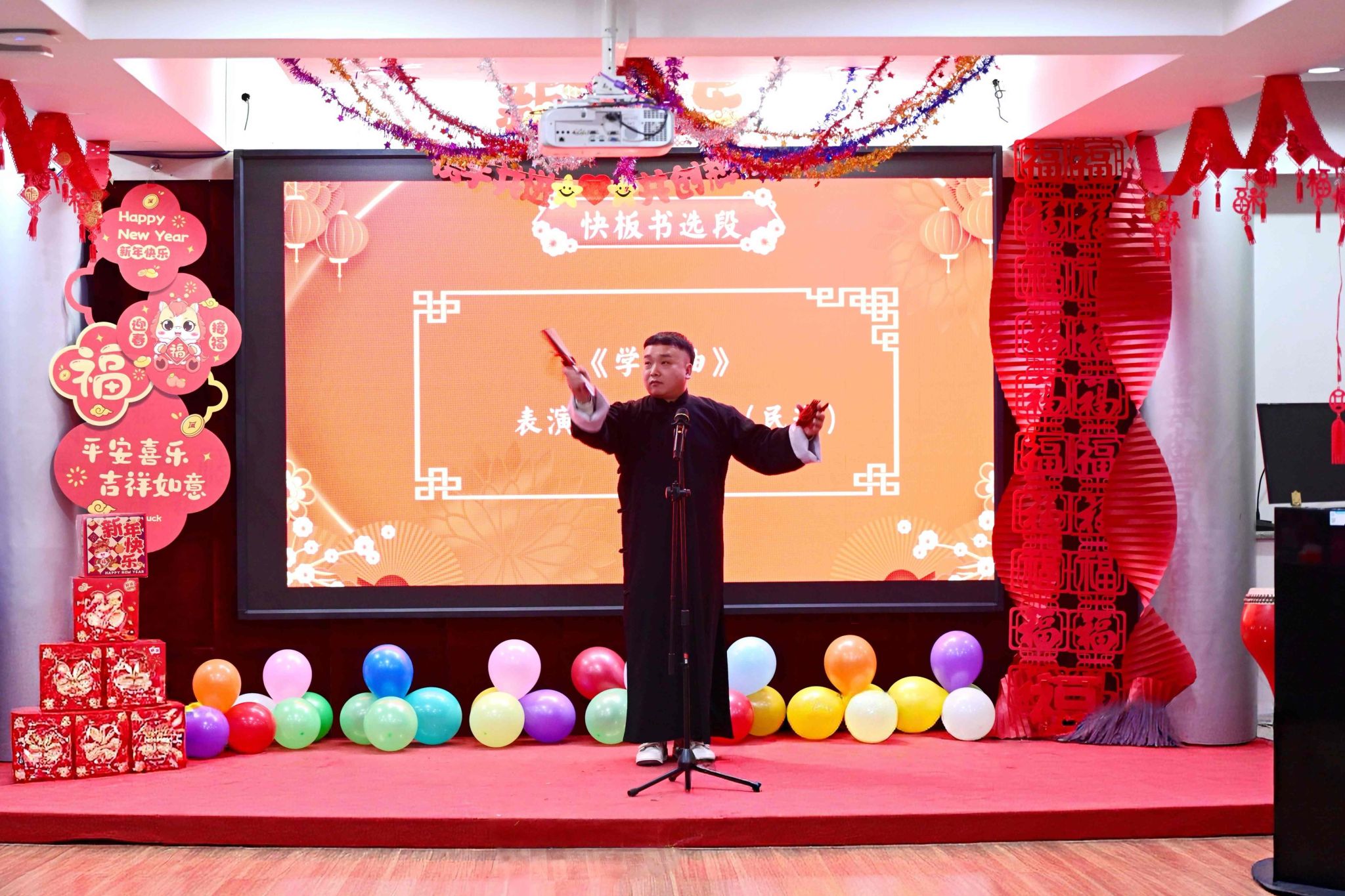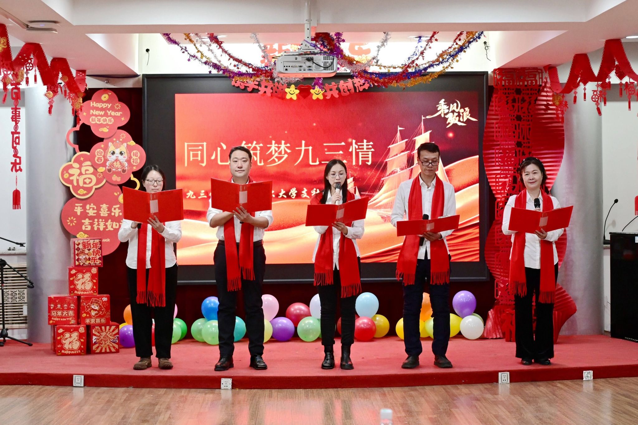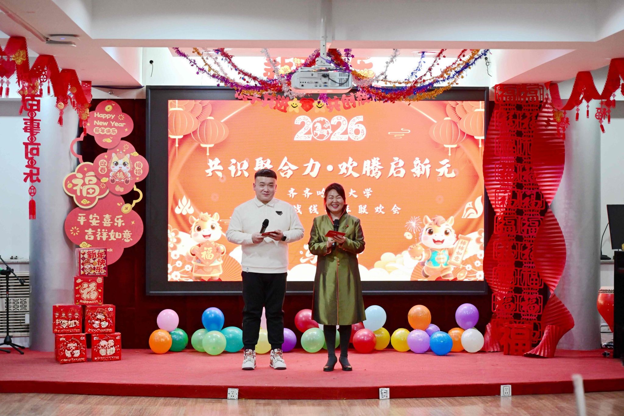 整场联欢会节目精彩纷呈、形式多样,歌曲演唱、诗歌朗诵、器乐演奏等精心编排的节目轮番上演,充分展现了统一战线成员昂扬向上、团结奋进的精神风貌。活动期间,校领导共同切开印有“石榴花开,齐大同心”字样的主题蛋糕,同享甜蜜、共送祝福,象征着齐大统战大家庭同心同德、手足相亲,携手共赴高质量发展新征程。“运球帷幄”“步步高升”两项互动游戏妙趣横生,有效活跃了现场氛围,彰显了统战成员协作共进的团队精神。整场活动掌声阵阵、笑语融融,既营造了温馨祥和的节日氛围,更凝聚了统战合力、增进了团结情谊,为新一年学校统战工作的深入推进奠定坚实基础,激励全体统战成员以更加饱满热情投身学校发展事业,携手共绘齐大发展新蓝图。