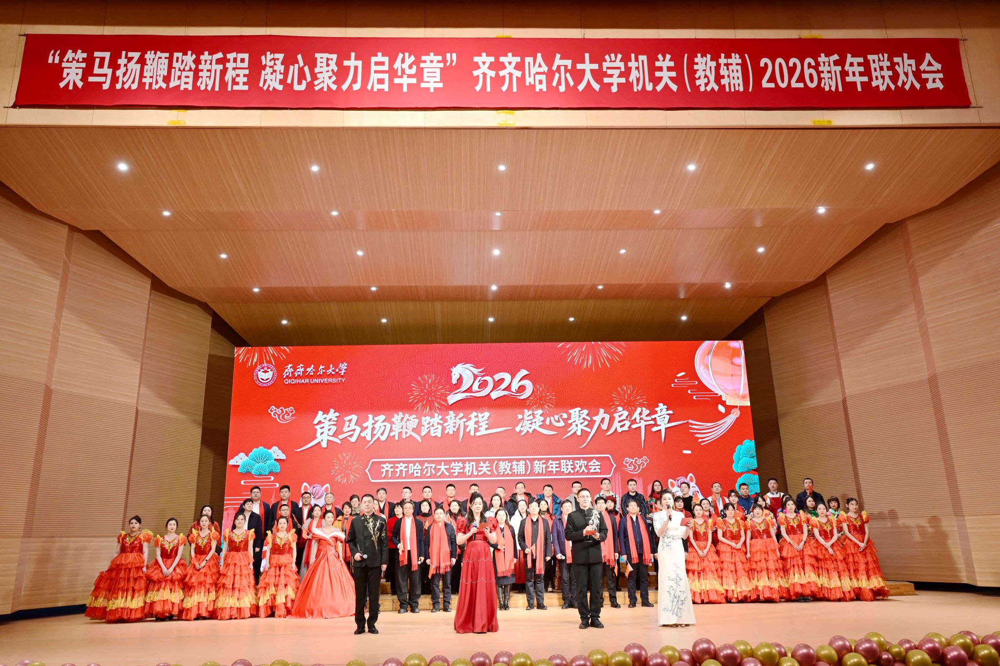 鹤舞北疆,弦歌激荡;岁序更迭,华章日新。12月29日下午,“策马扬鞭踏新程 凝心聚力启华章”学校机关(教辅)2026新年联欢会在音乐厅举行。校领导与全体机关(教辅)教职工欢聚一堂,共迎新春。
