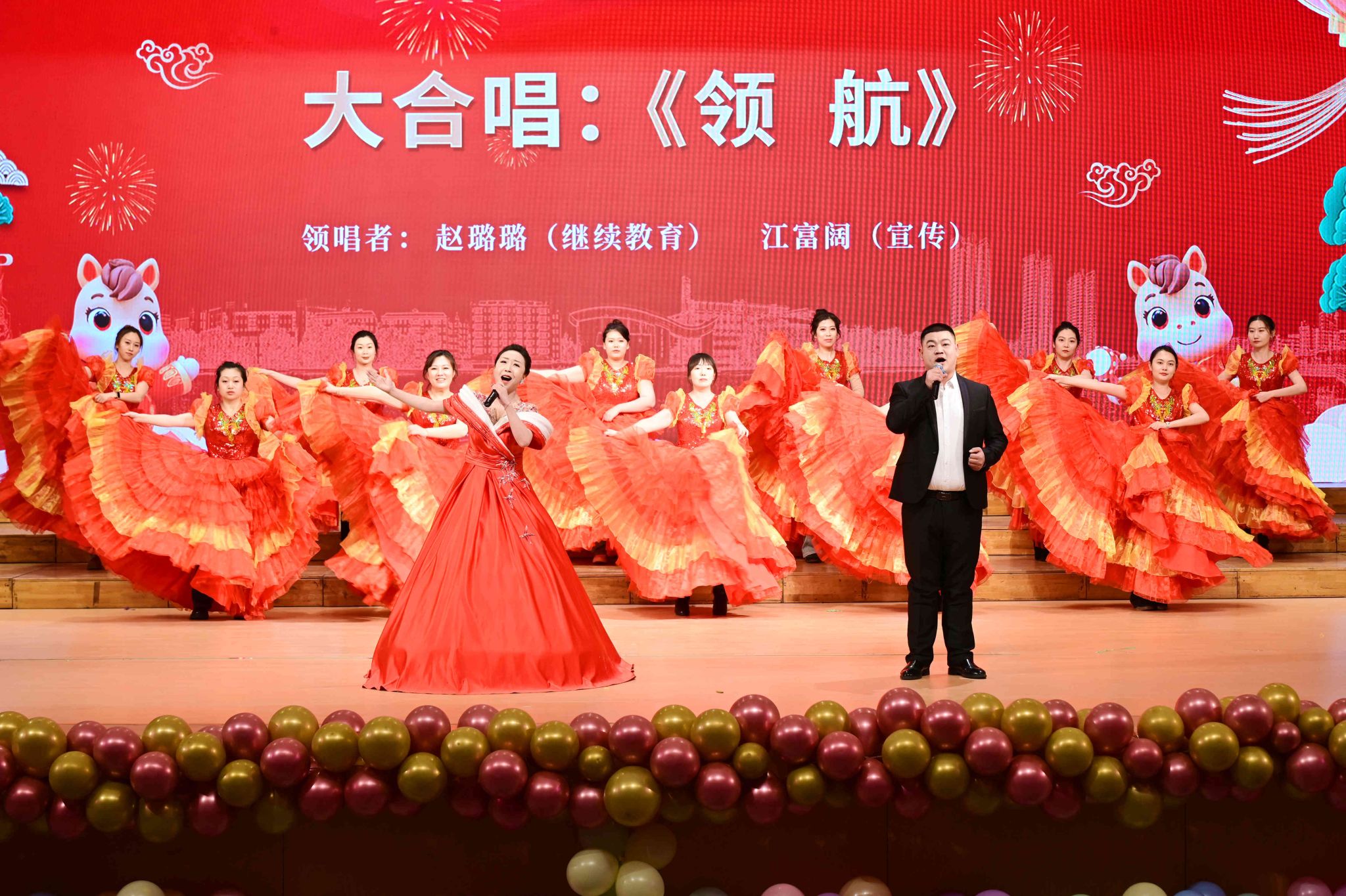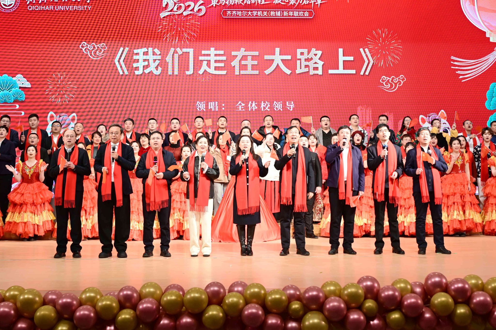 最后,由校领导领唱,全体演职人员和全场观众共同激昂高歌《我们走在大路上》,伴随着磅礴的声浪,2026年机关(教辅)联欢会圆满落下帷幕。