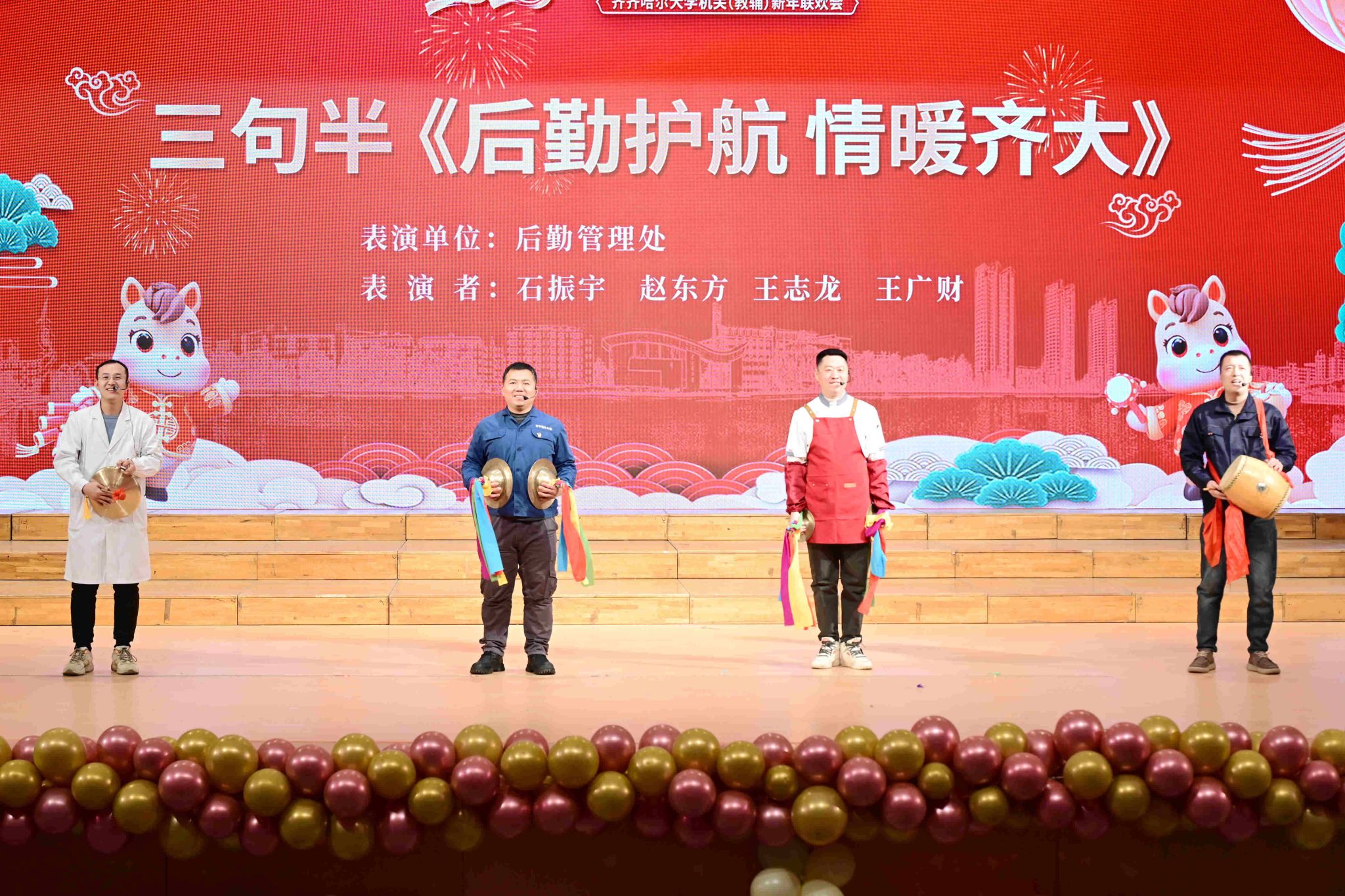 由后勤管理处带来的三句半《后勤护航情暖齐大》,生动展现后勤保障队伍默默付出、服务师生的暖心服务工作日常。