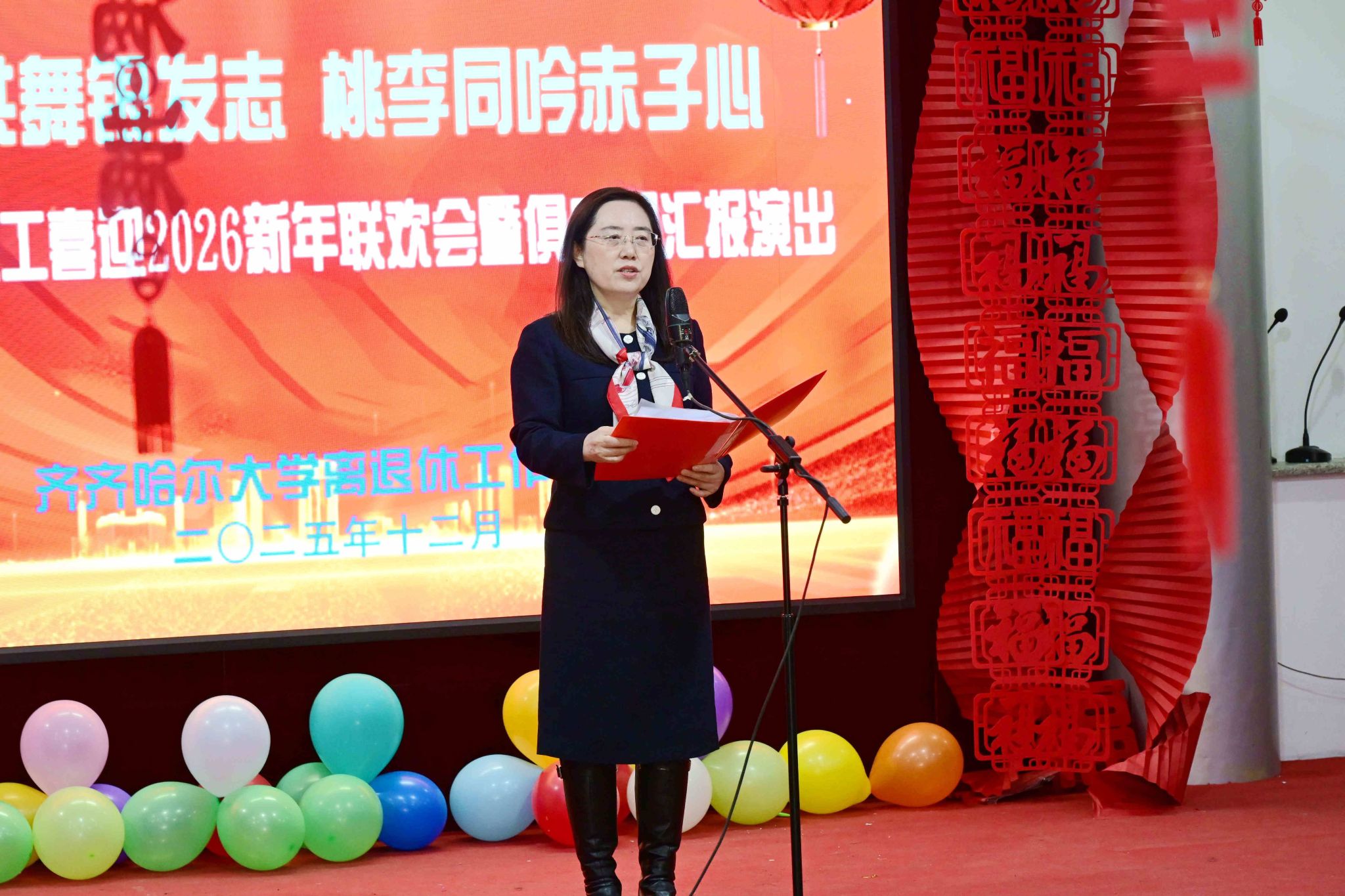 党委书记丁宏代表学校党委和全体师生,向为学校发展倾注心血、奉献余热的离退休教职工致以最诚挚的新年祝福和最崇高的敬意,向长期以来关心支持学校发展的离退休教职工及其家属表示最衷心的感谢。她指出,离退休老同志是学校宝贵的精神财富,学校每一步跨越、每一项成就,都凝结着老同志们的心血和汗水,镌刻着大家的奋斗与荣光;她强调,新的一年学校党委将一如既往重视和加强离退休工作,持续优化健康服务、丰富文化生活、完善保障机制,让老同志们政治上有荣誉感、生活上有幸福感、精神上有归属感。她真诚期盼各位前辈为学校建设发展建言献策、鼓劲加油,与全校师生一道凝心聚力、攻坚克难,共同推动学校事业发展取得新的更大成绩。