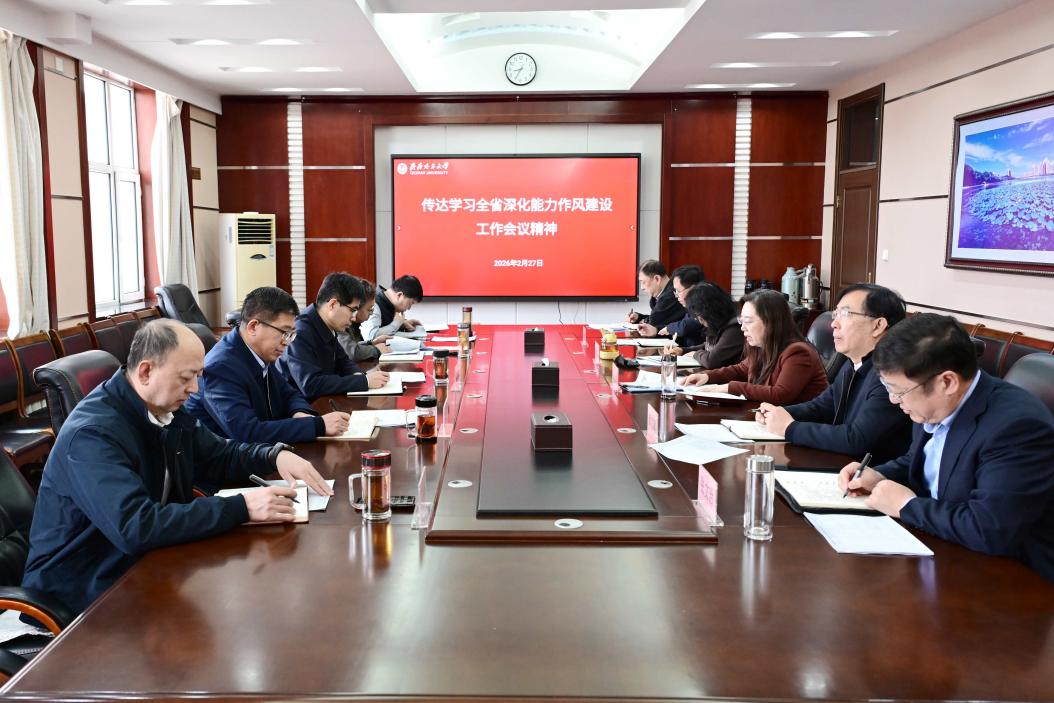 2月27日上午,学校党委在办公楼504室召开领导班子专题会议,传达学习全省深化能力作风建设工作会议精神。校党委书记丁宏主持会议并传达省委书记许勤在全省深化能力作风建设工作会议讲话精神和省委常委、组织部部长杨博就《全省深化干部能力作风建设2026年实施方案》作的说明,就学校深化干部能力作风建设,推动办学事业高质量发展提出具体要求。