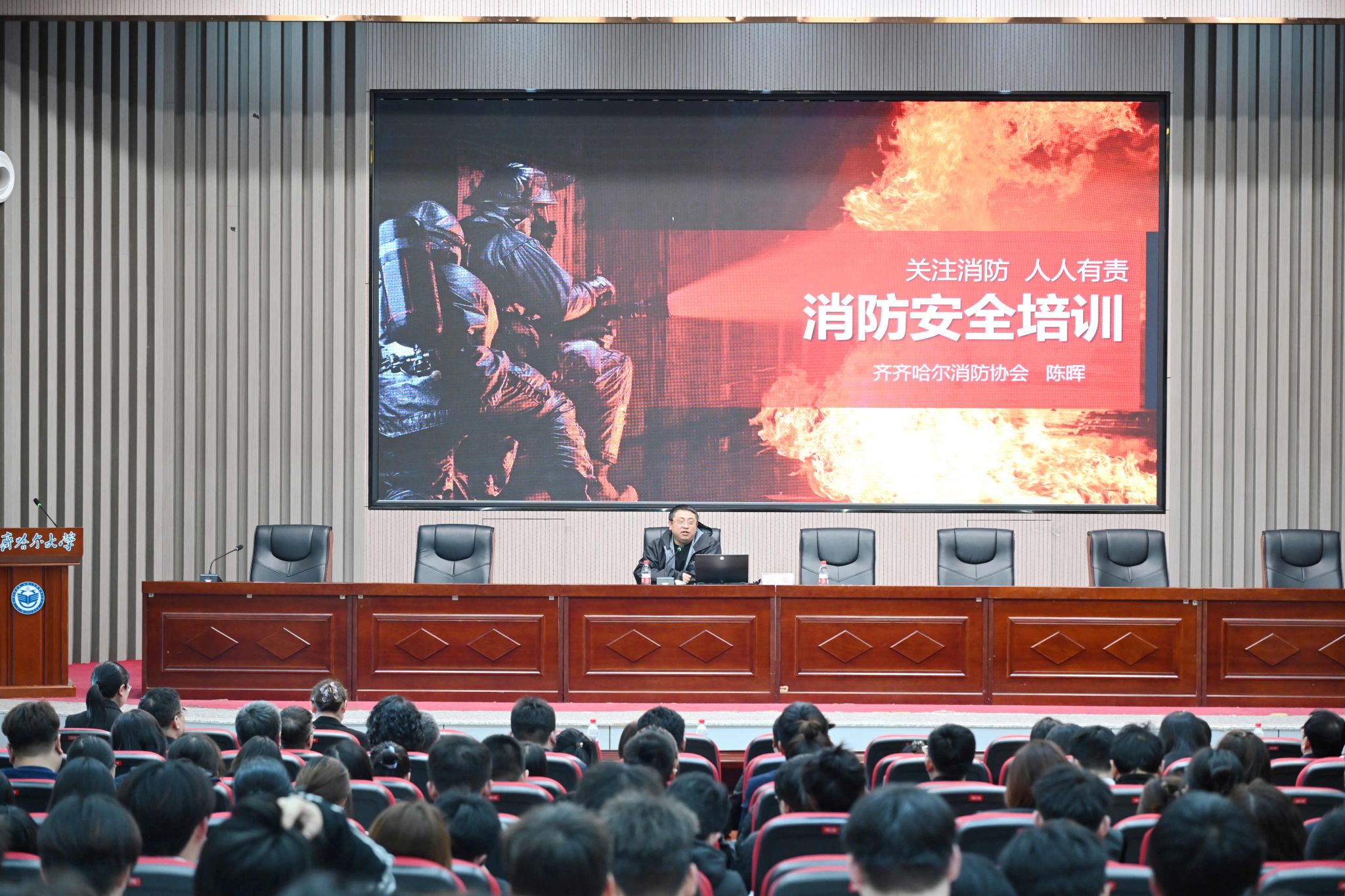 启动仪式后,学校特邀齐齐哈尔市消防协会党支部书记陈晖作《关注消防人人有责》主题消防安全培训。陈晖结合典型火灾案例,深入分析火灾成因、危害与防控要点,通过视频演示、实操讲解,让师生直观掌握火灾报警、初期扑救、应急逃生等基本技能,有效提升消防安全意识与自防自救能力。