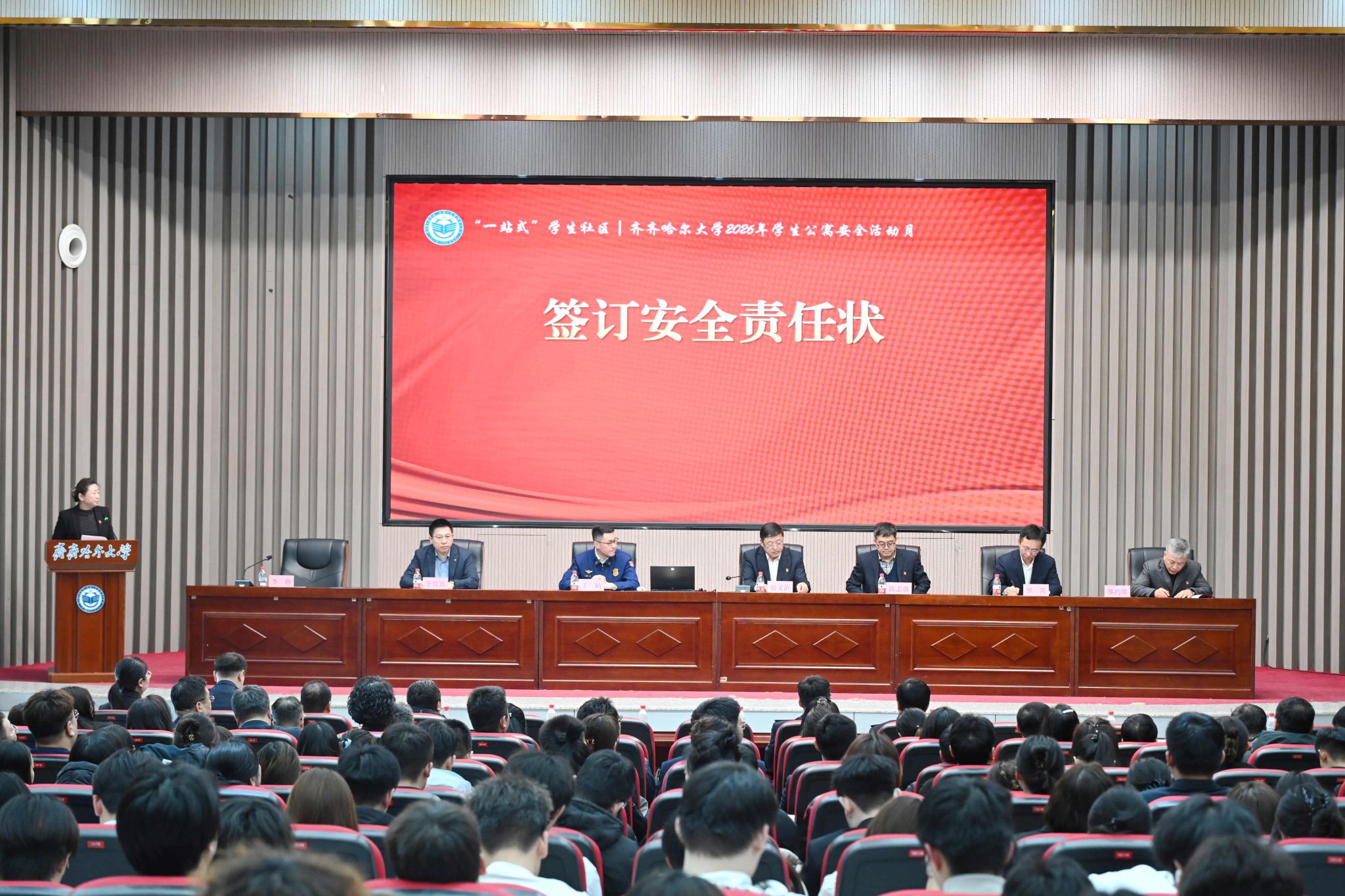 启动仪式在庄严的国歌中正式开始。学生工作部(学生处、武装部)部(处)长罗霄宣读了《“一站式”学生社区丨齐齐哈尔大学2026年学生公寓安全活动月实施方案》,明确活动目标、内容与安排。