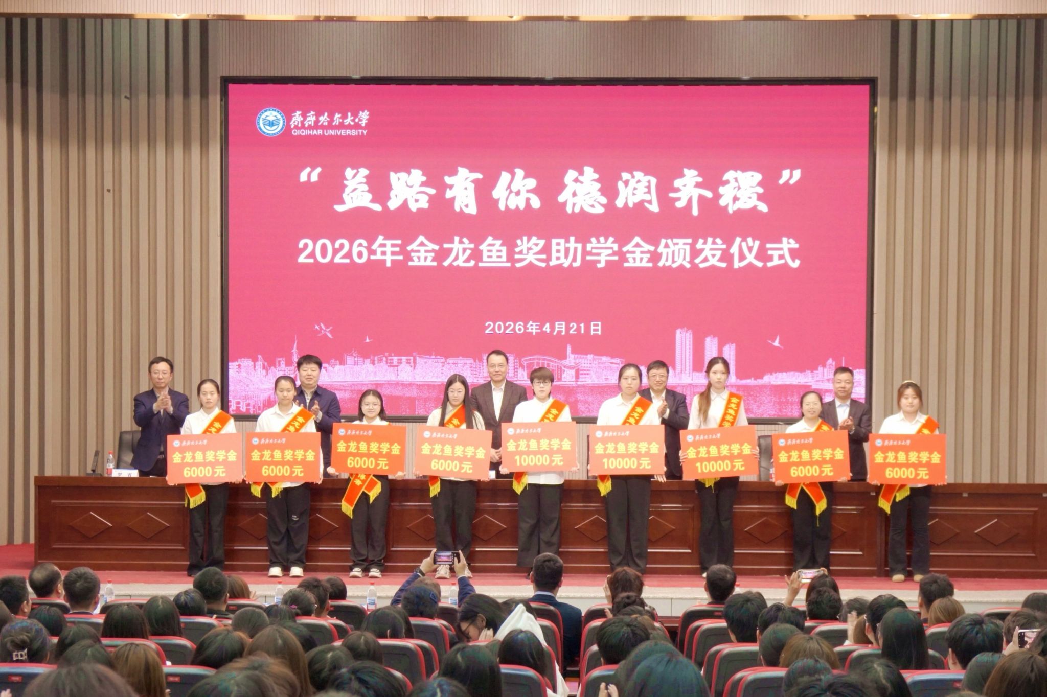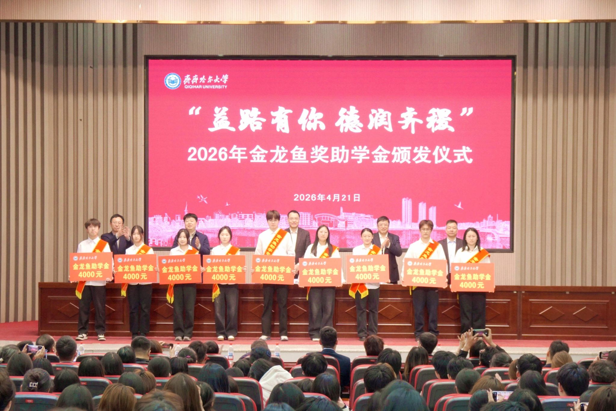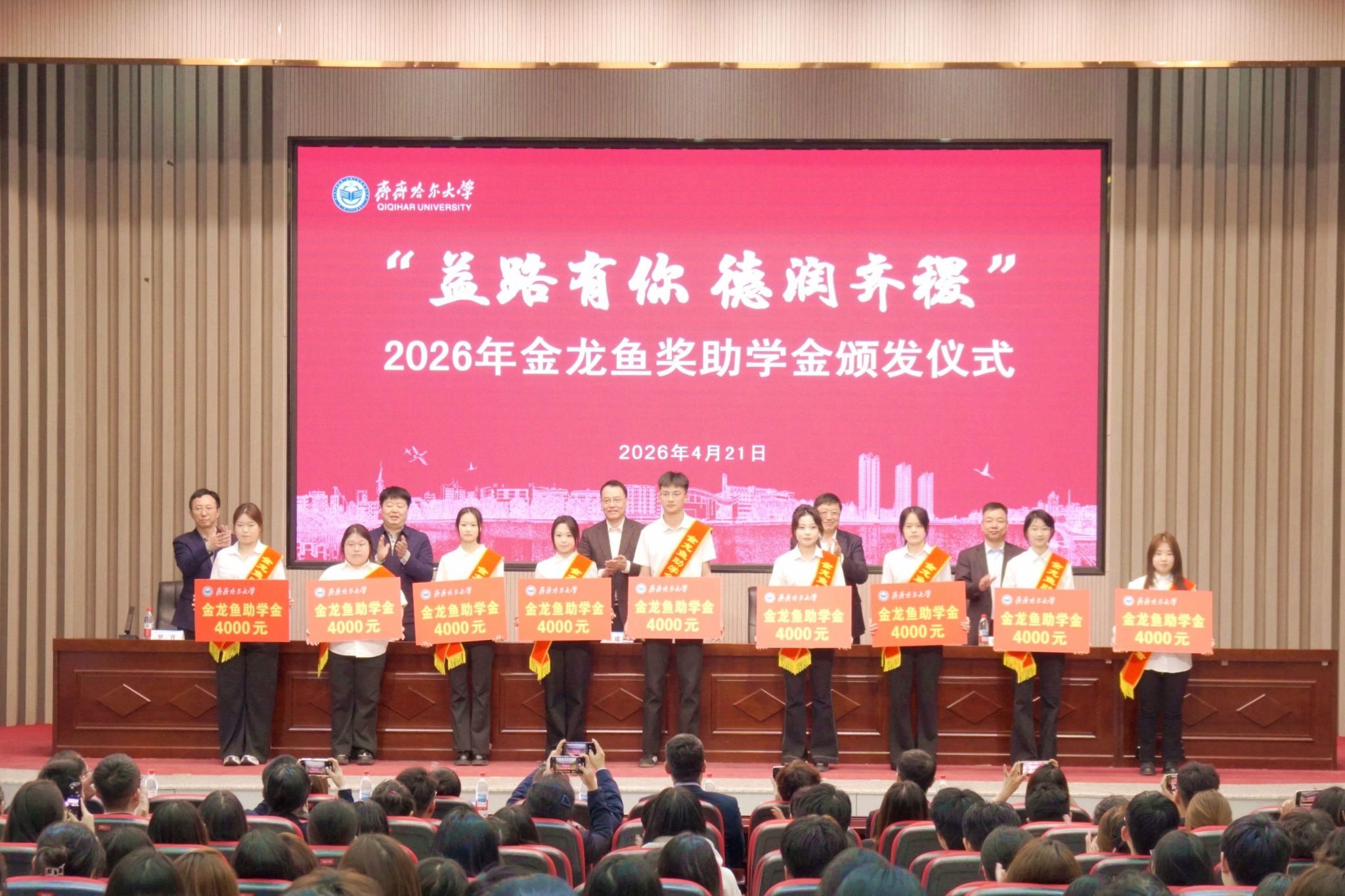 4月21日,齐齐哈尔大学2026年“益路有你,德润齐稷”金龙鱼奖助学金颁发仪式于日新大厦四楼报告厅举行。益海嘉里集团领导、校领导、获奖受助学生代表及相关部门和各学院师生齐聚一堂,共同见证爱心善举的传递与立德树人的丰硕成果。