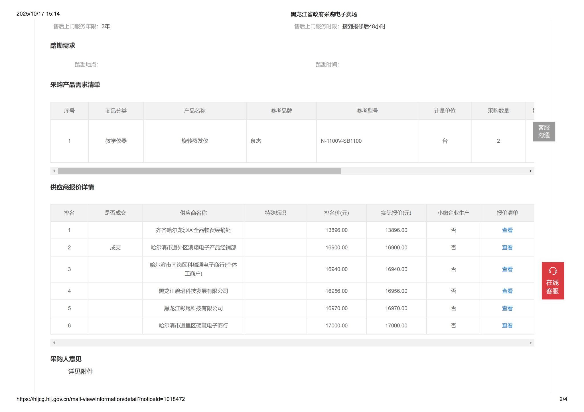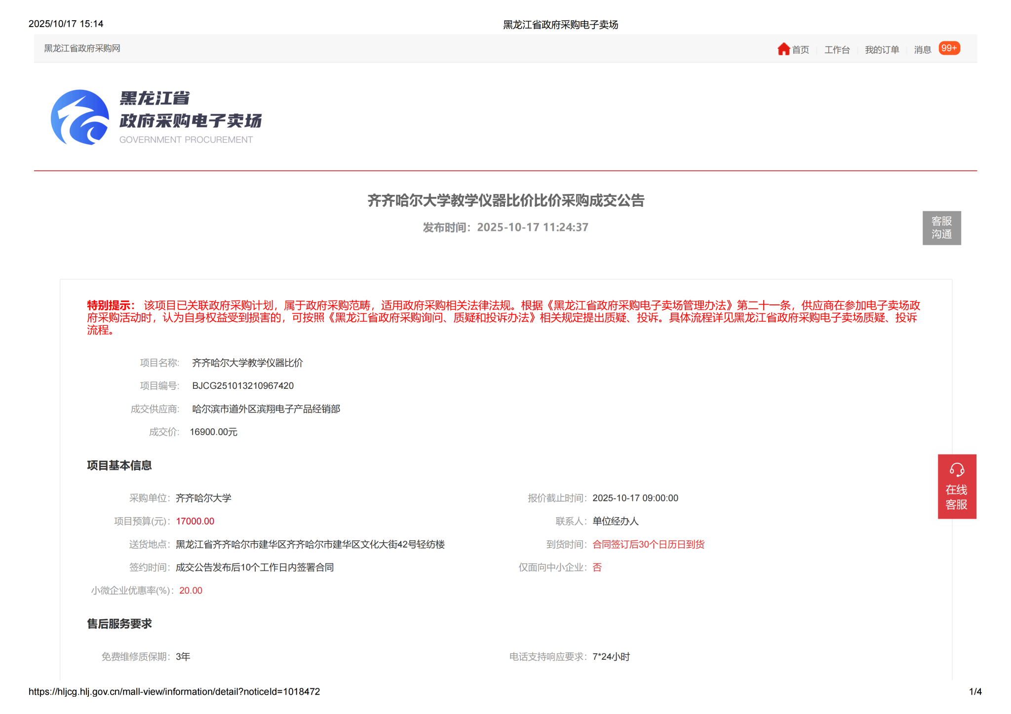 齐齐哈尔大学教学仪器比价采购成交公告(转自黑龙江省政府采购网)