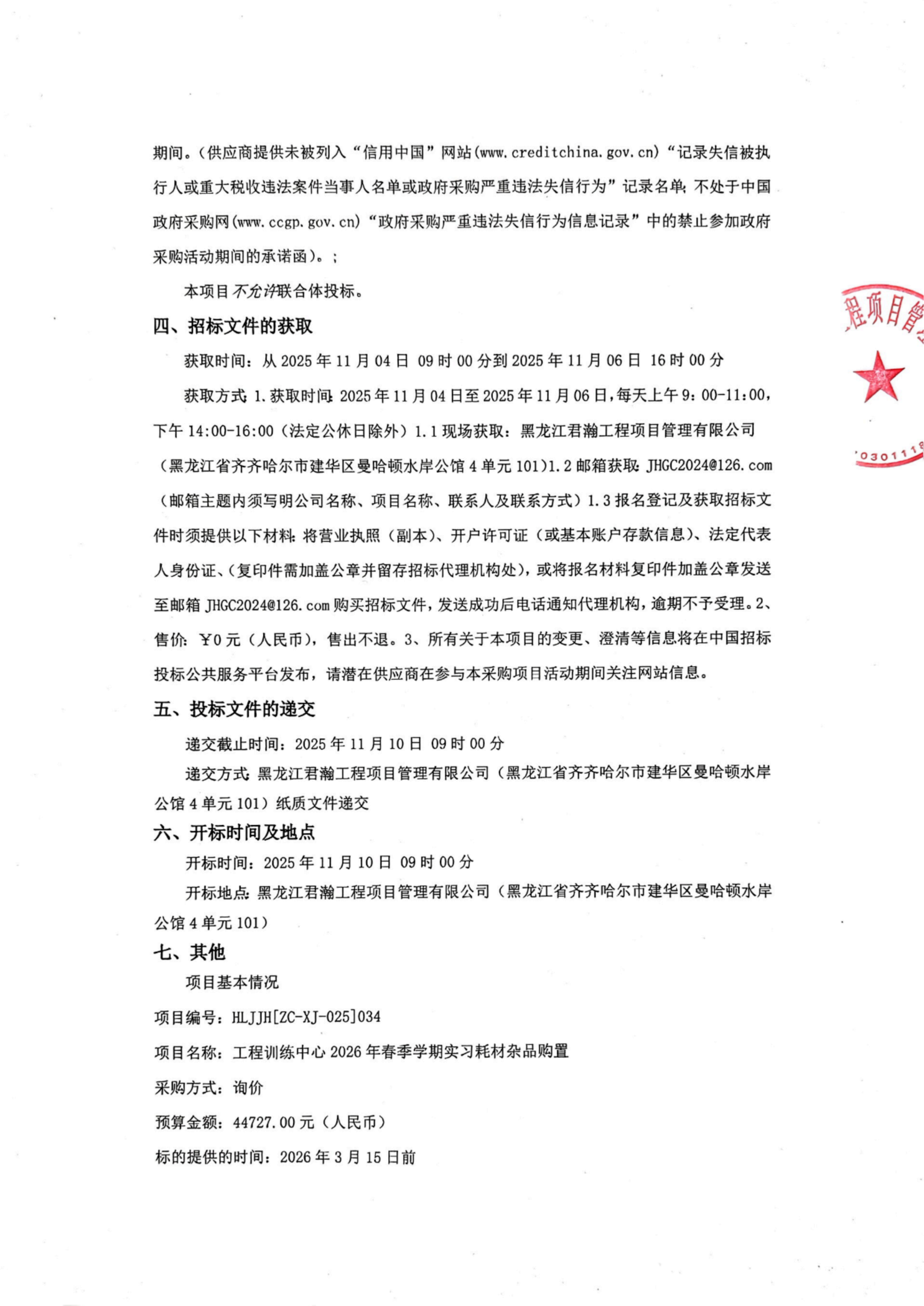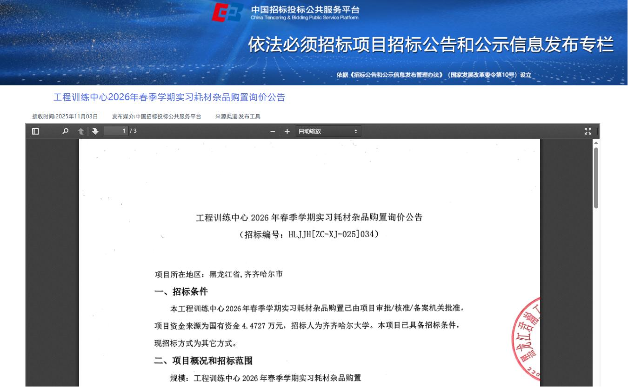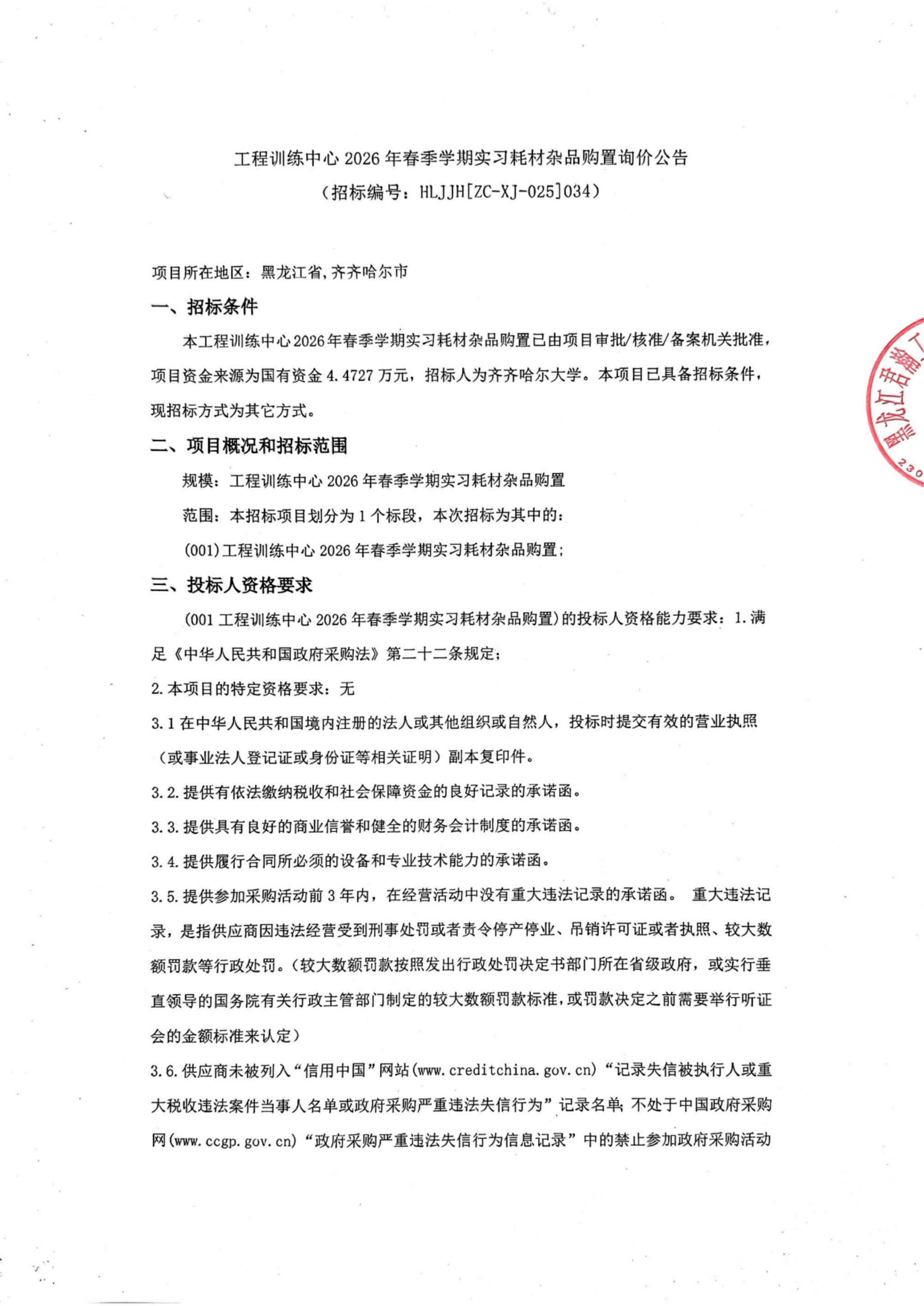 工程训练中心2026年春季学期实习耗材杂品购置询价公告(转自中国招标投标公共服务平台)