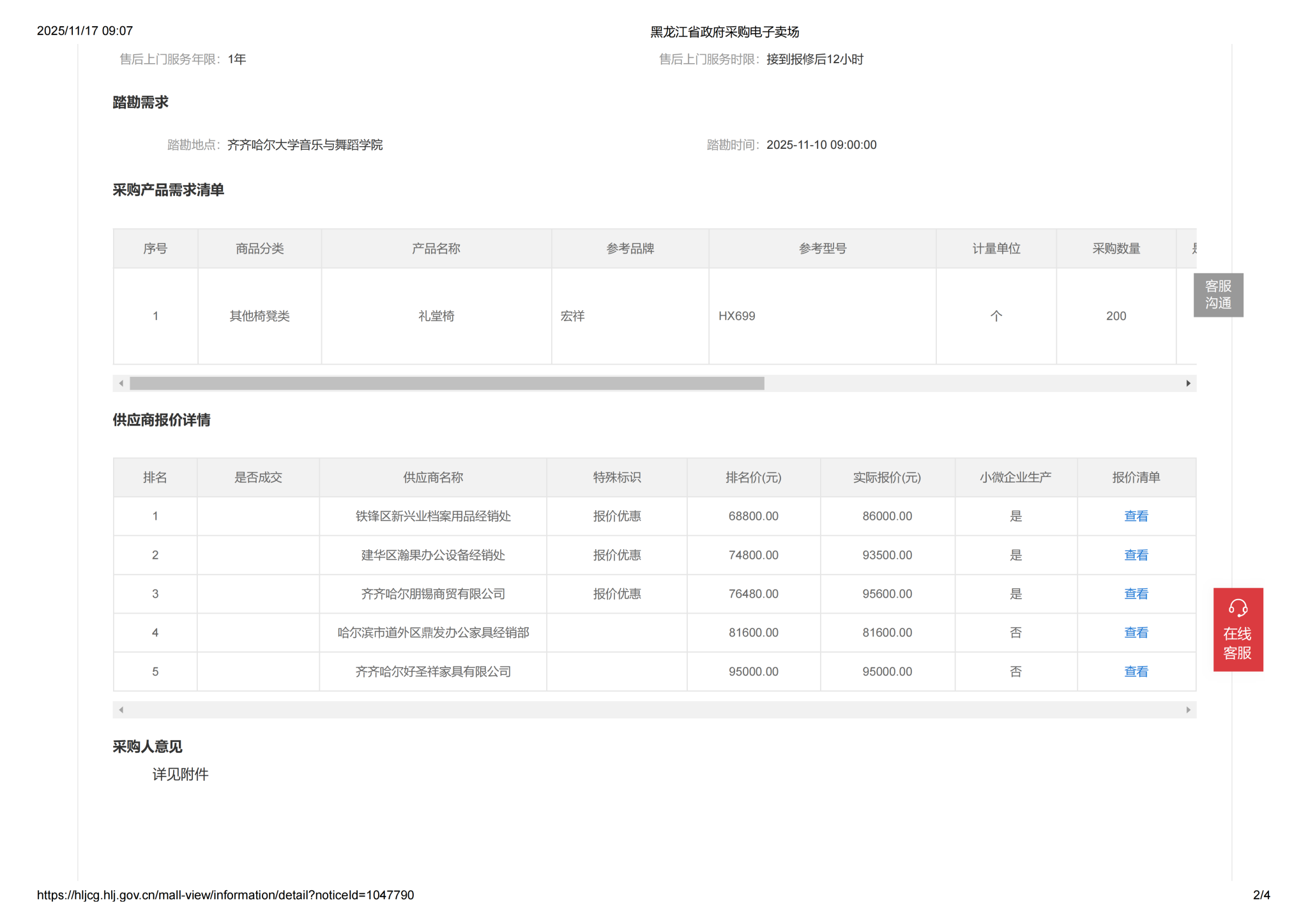 齐齐哈尔大学其他椅凳类比价采购废标公告(转自黑龙江省政府采购网)