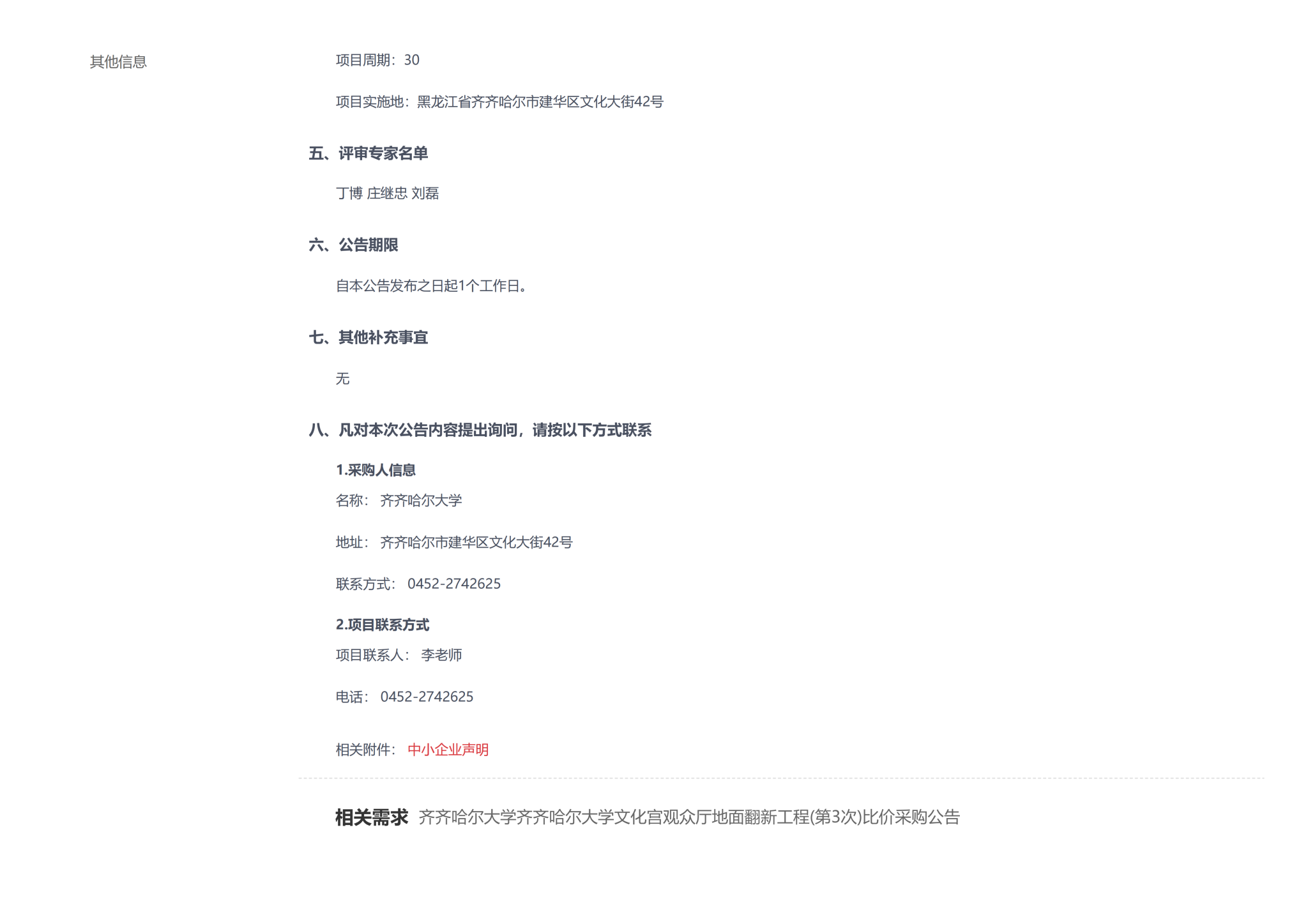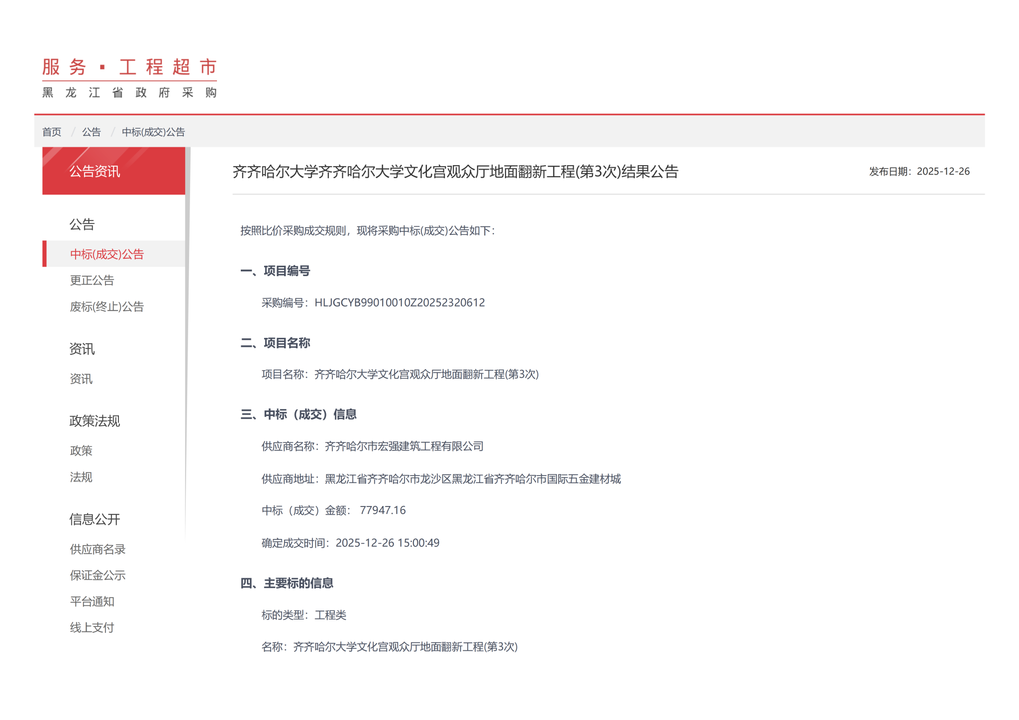 齐齐哈尔大学文化宫观众厅地面翻新工程(第3次)结果公告(转自黑龙江省政府采购网)