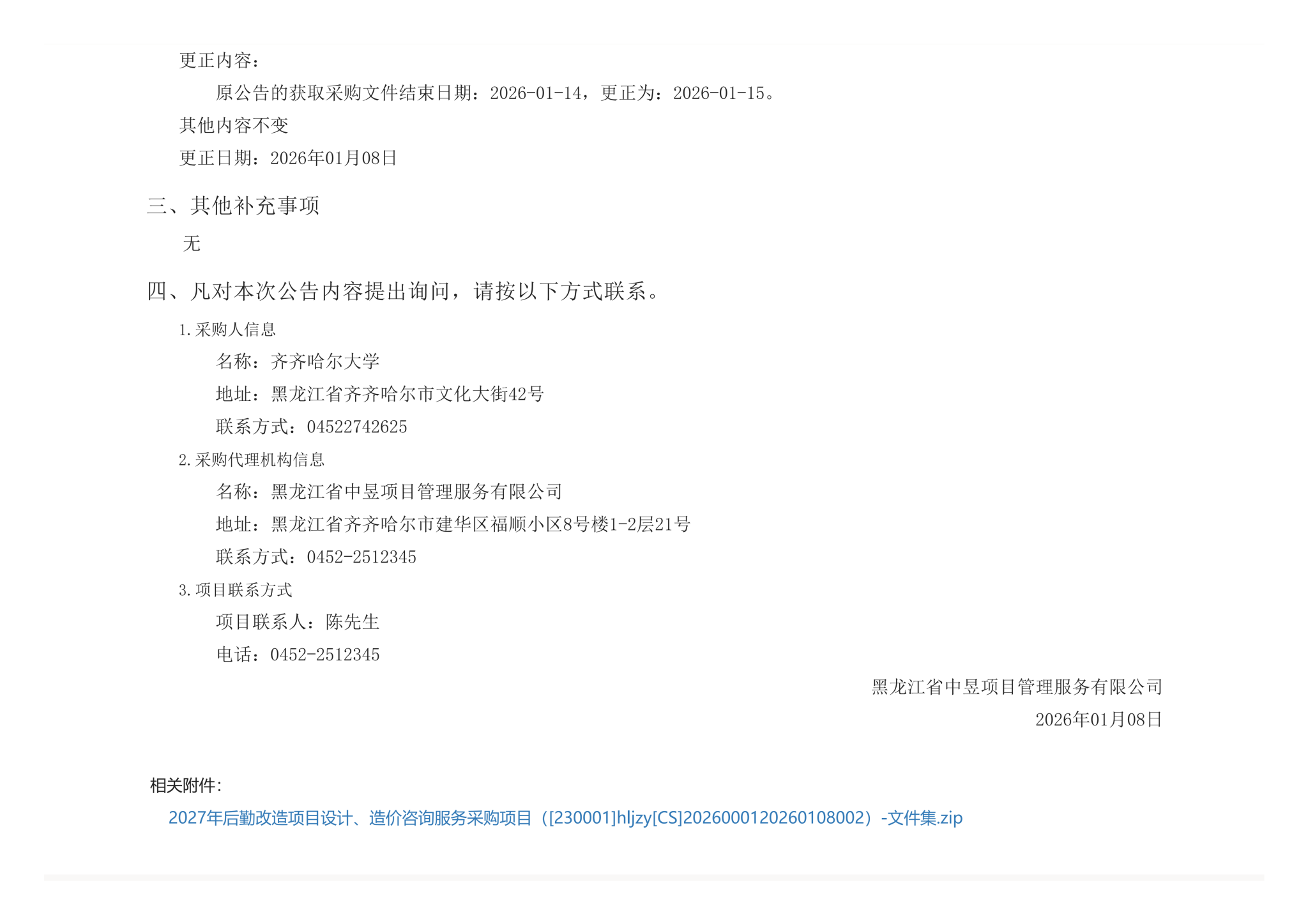 下一条:齐齐哈尔大学2027年后勤改造项目设计、造价咨询服务采购项目竞争性磋商公告(转自黑龙江省政府采购网)
