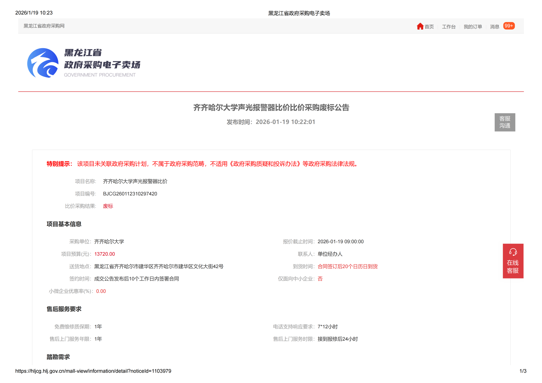 上一条:齐齐哈尔大学食堂燃气报警控制系统比价采购废标公告(三次)(转自黑龙江省政府采购网)