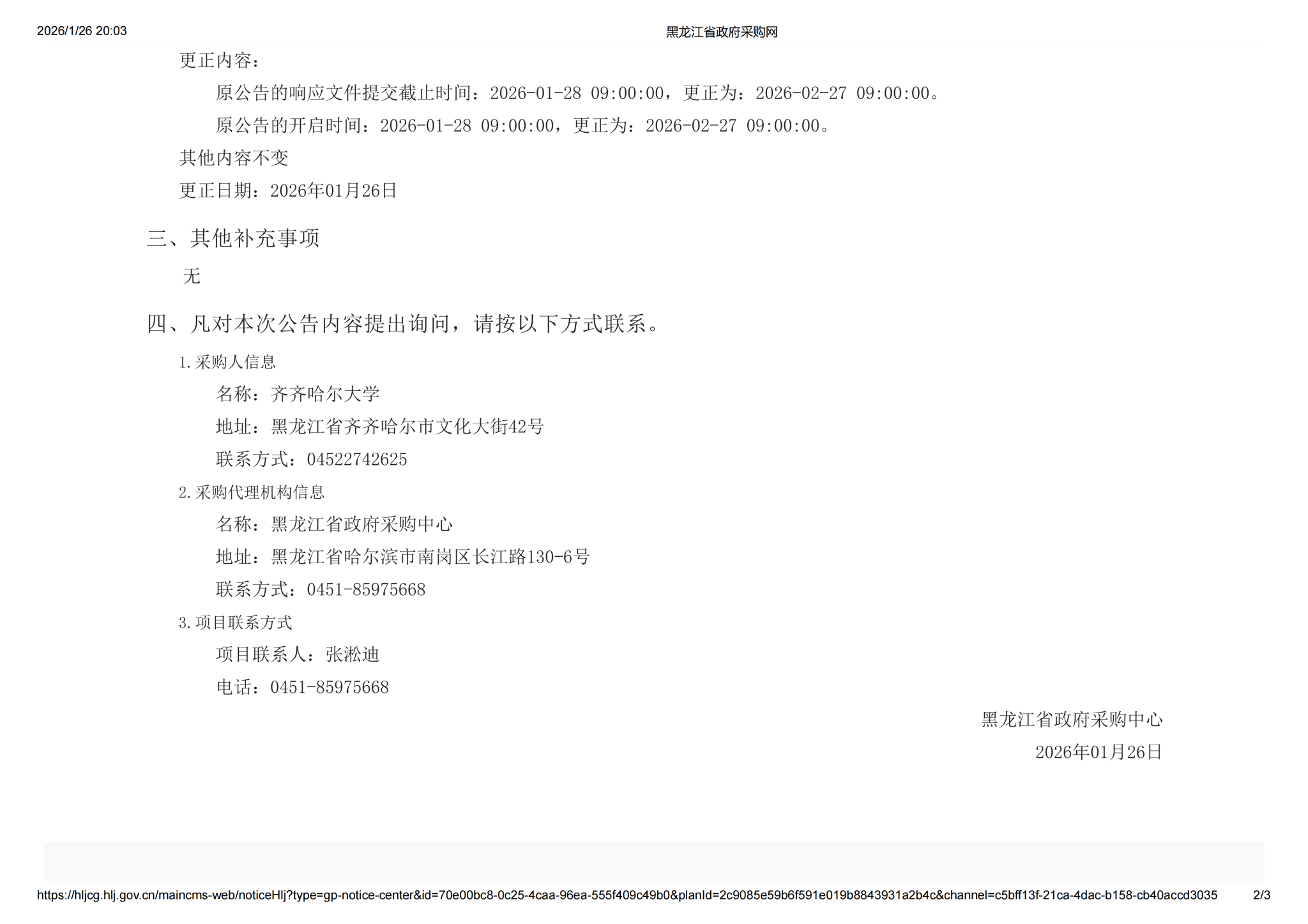 齐齐哈尔大学2026年维修工程项目竣工结算审核服务采购更正公告(第一次)(转自黑龙江省政府采购网)