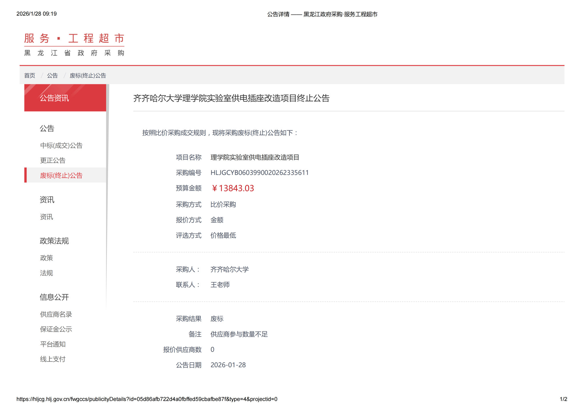 上一条:齐齐哈尔大学理学院实验室供电插座改造项目(第2次)比价采购公告(转自黑龙江省政府采购网)