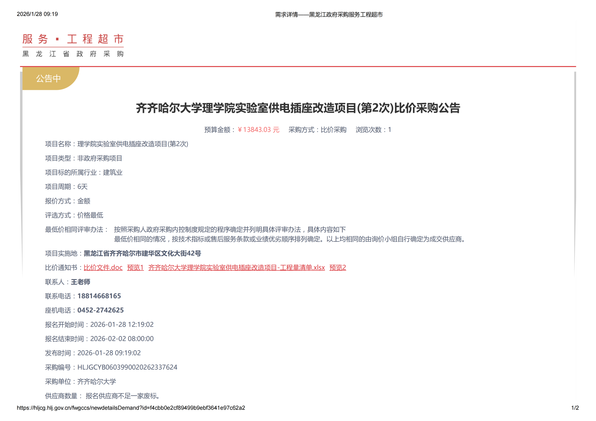 上一条:齐齐哈尔大学理学院实验室供电插座改造项目(第2次)结果公告(转自黑龙江省政府采购网)