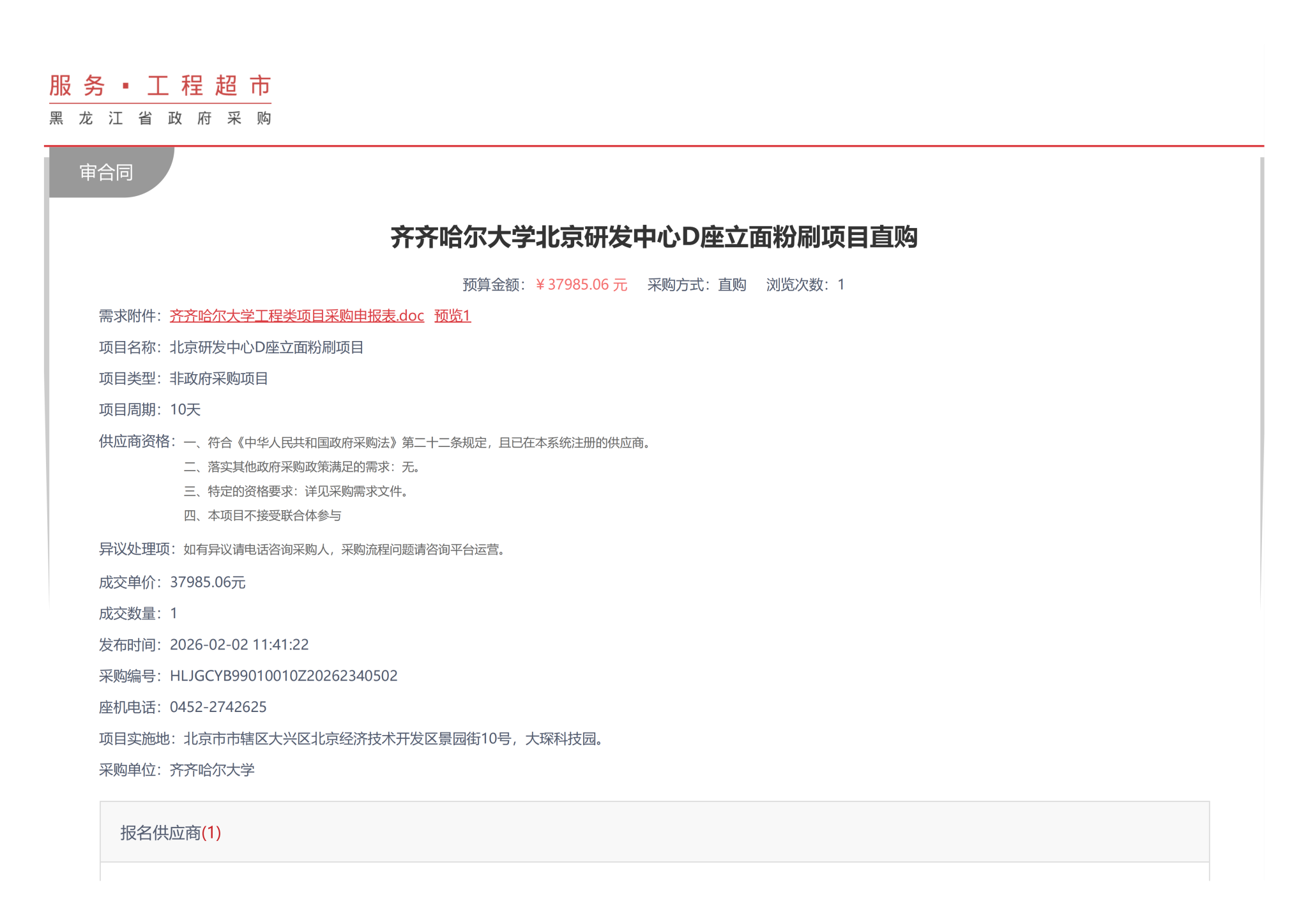 齐齐哈尔大学北京研发中心D座立面粉刷项目直购(转自黑龙江省政府采购网)