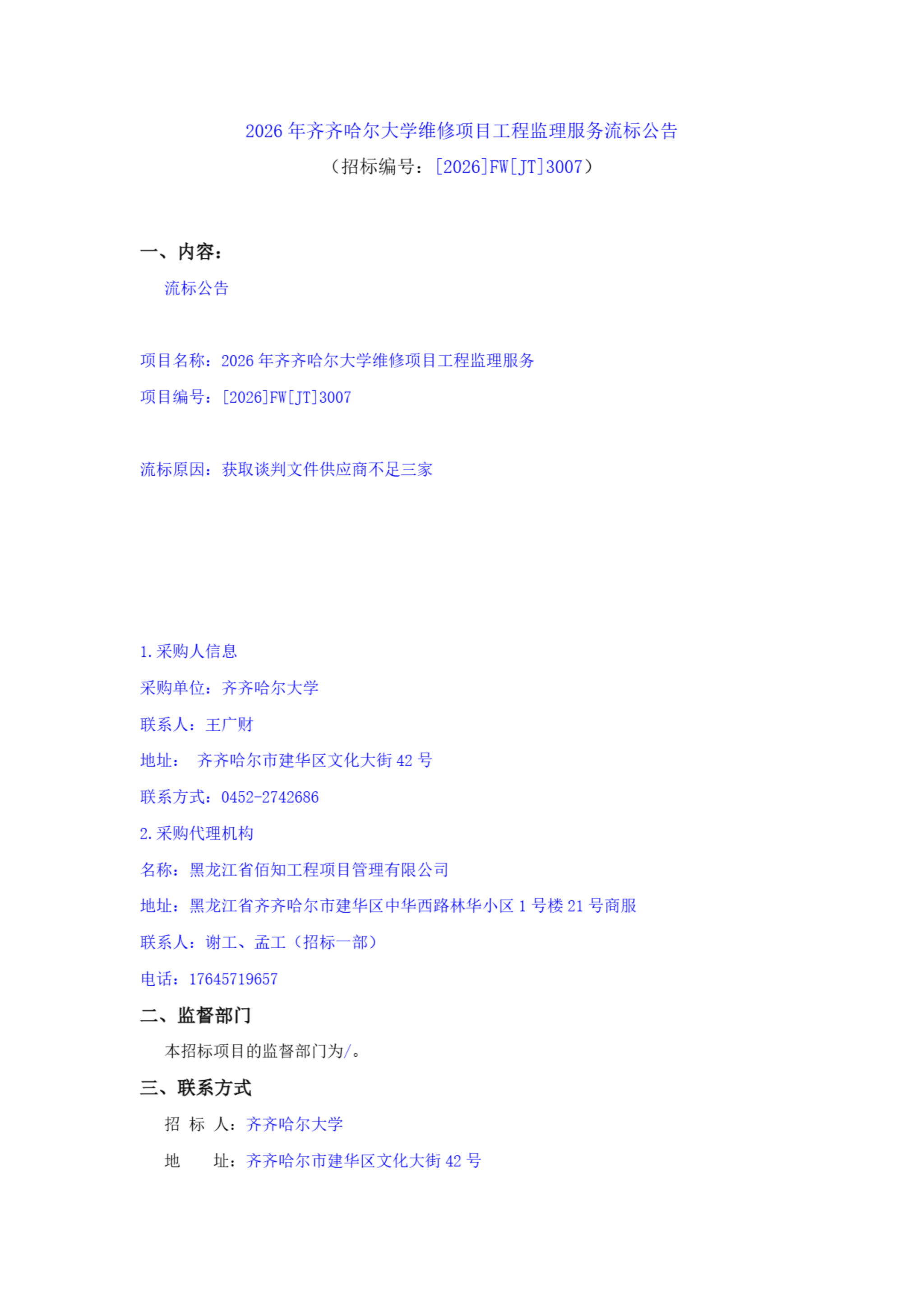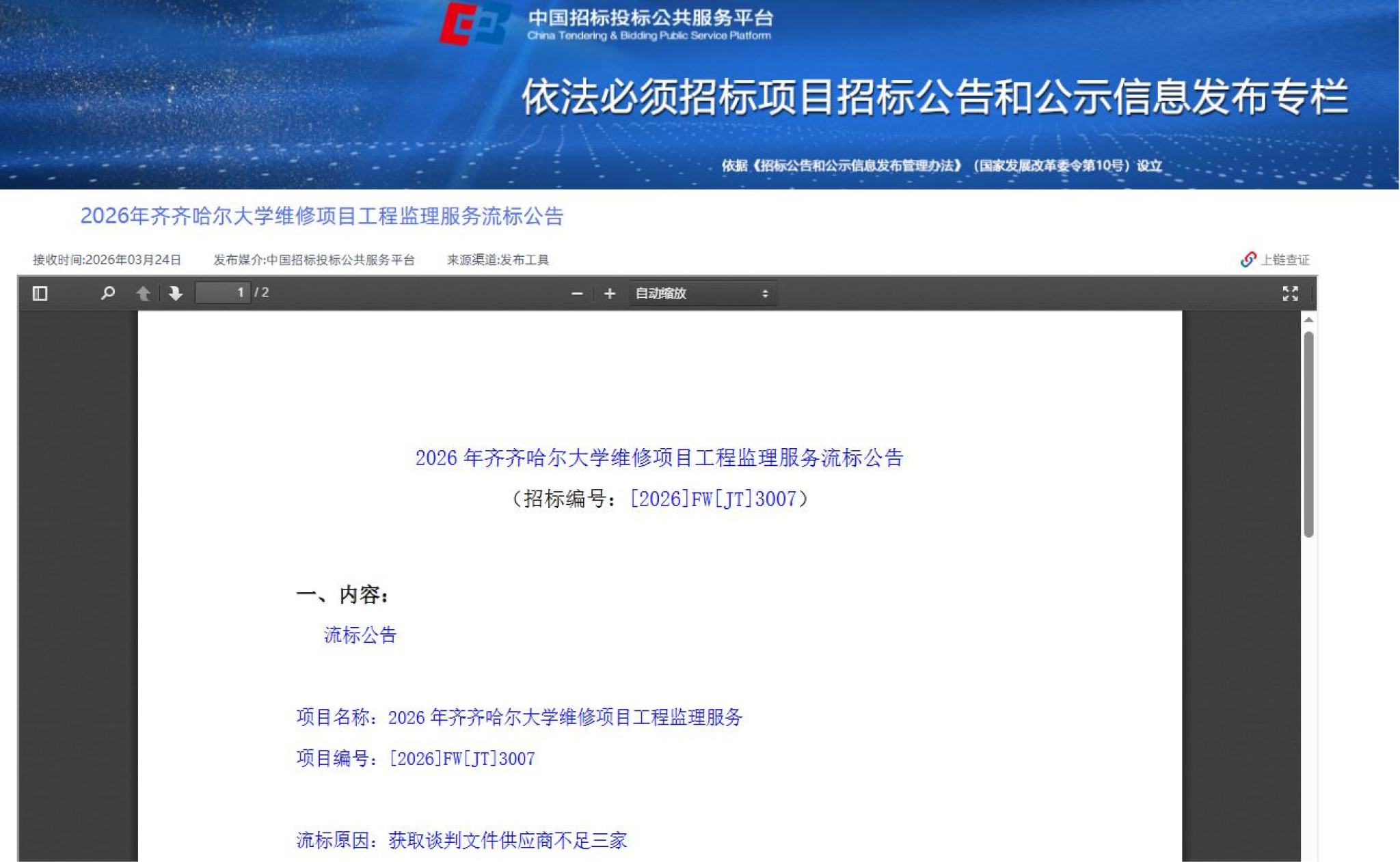 上一条:2026年齐齐哈尔大学维修项目工程监理服务(二次)(转自中国招标投标公共服务平台)
