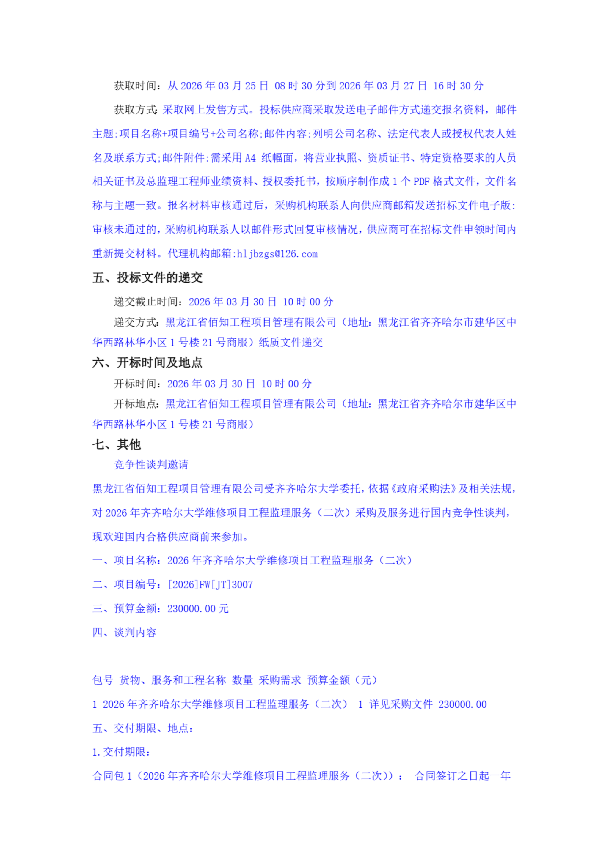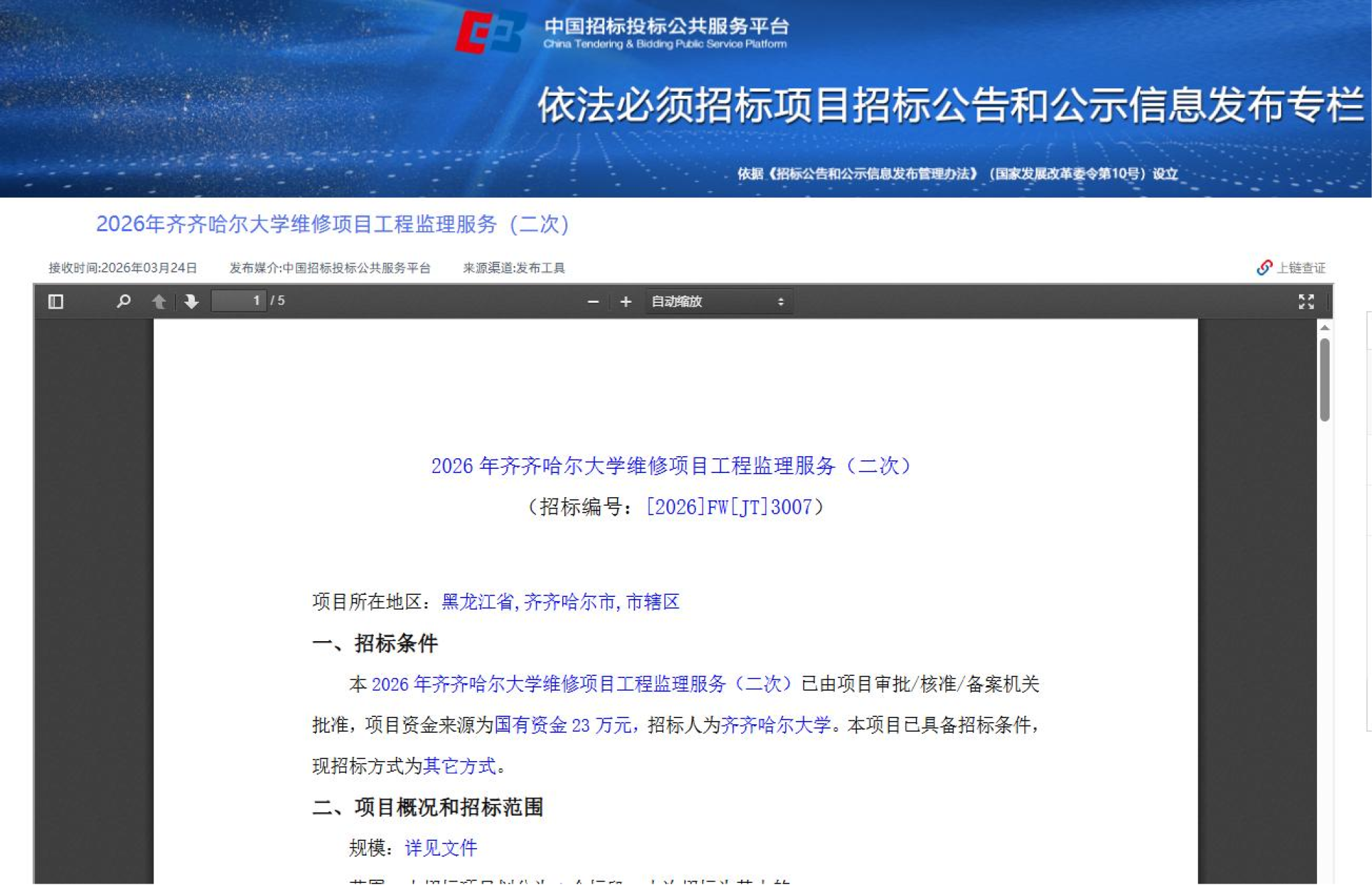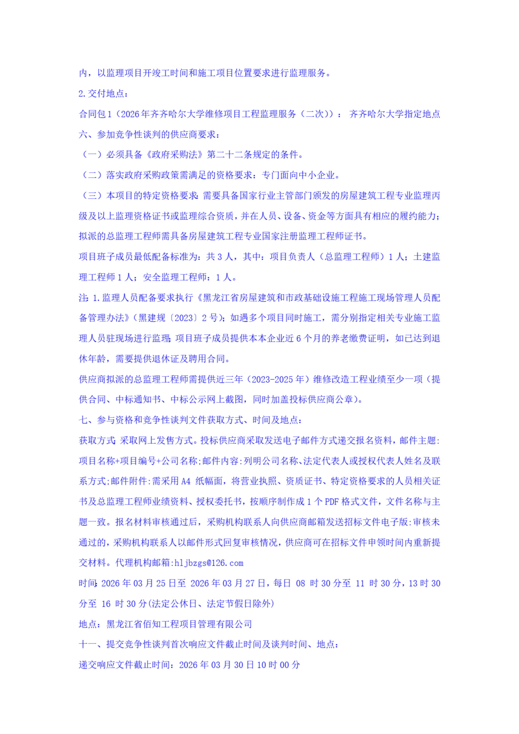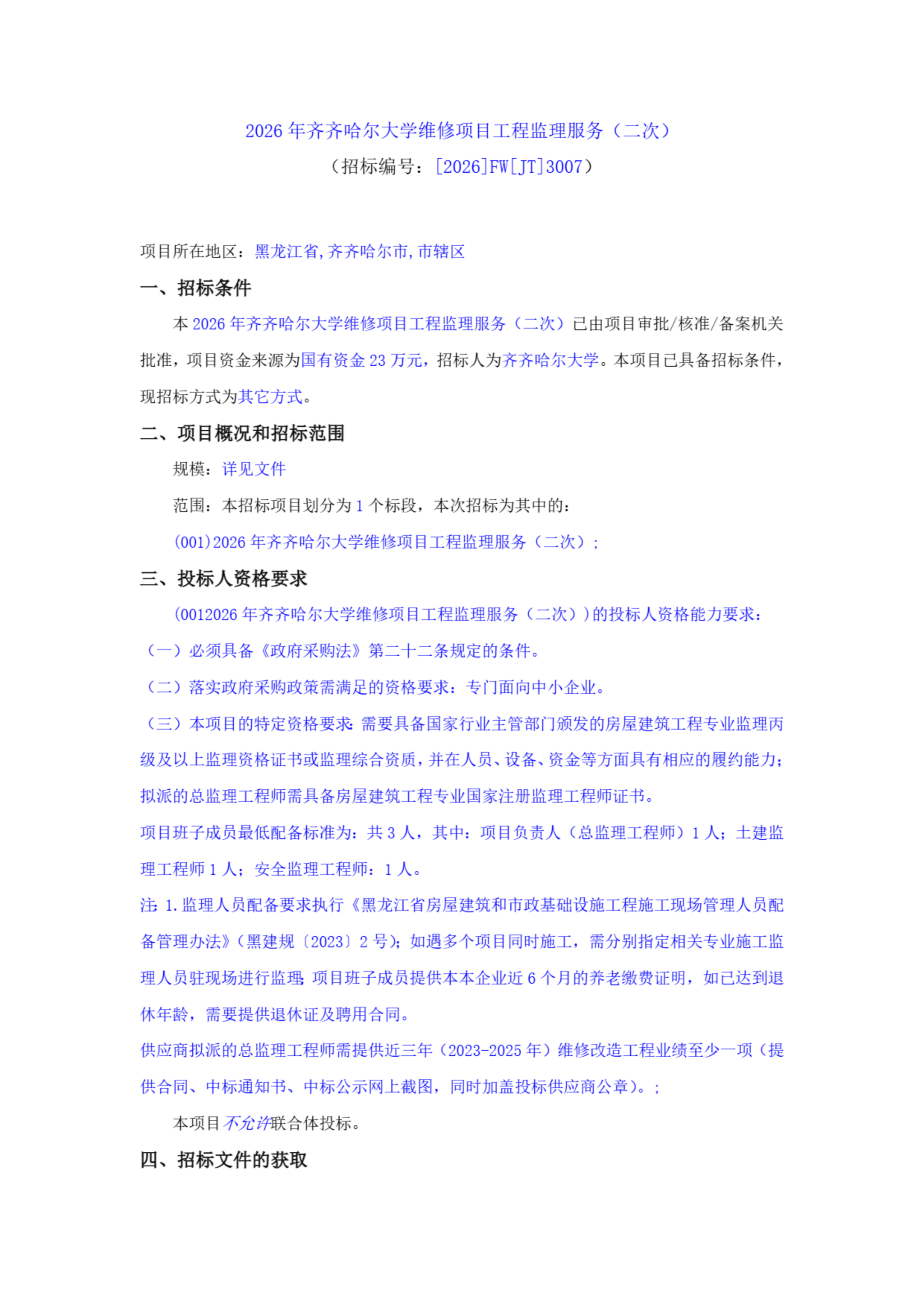 2026年齐齐哈尔大学维修项目工程监理服务(二次)(转自中国招标投标公共服务平台)