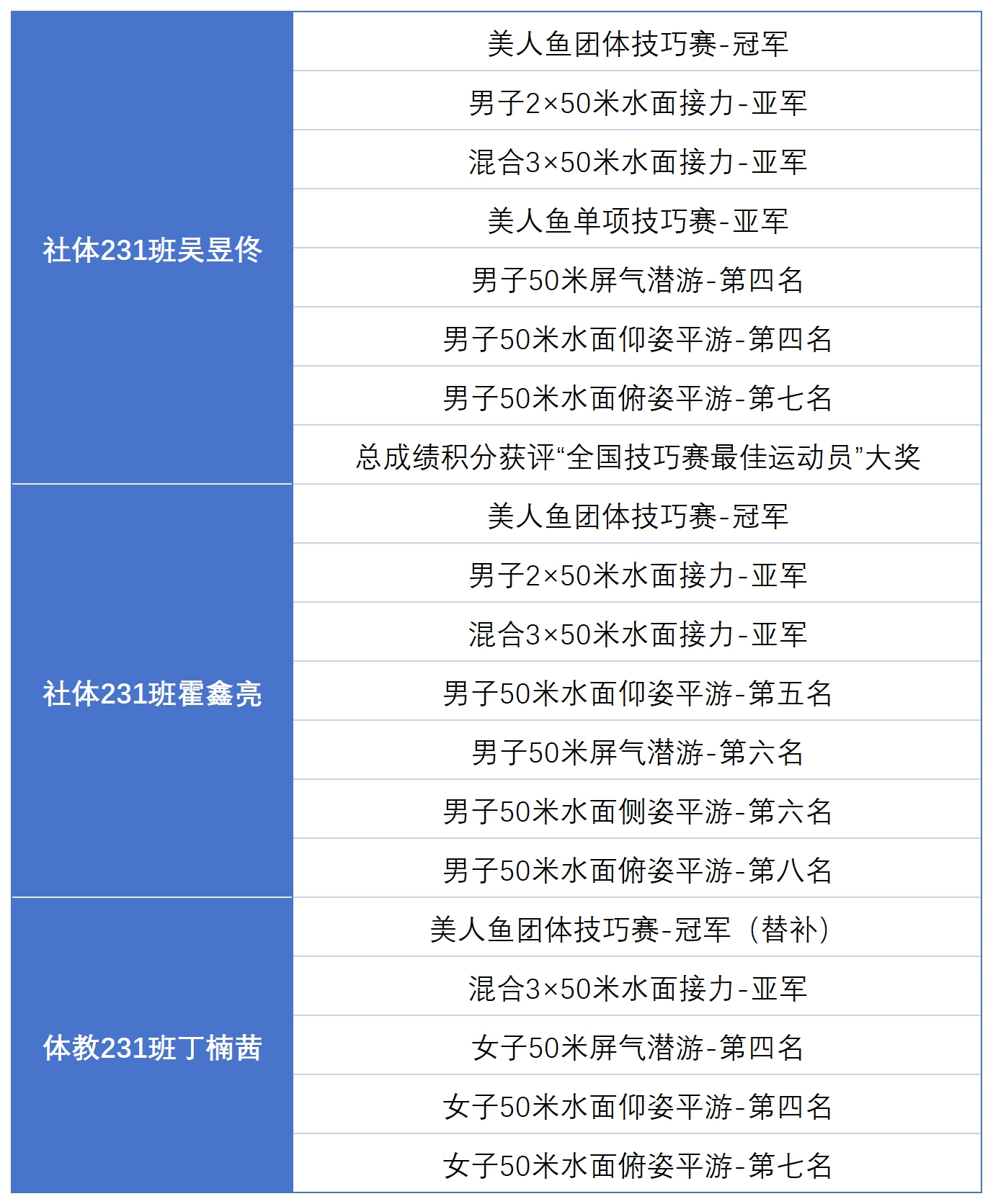 此次佳绩的取得,得益于学校与体育学院的全面支持、教师的专业指导以及队员的刻苦训练。备赛期间,由体育学院张津铭老师全程指导,依托“专业课程+赛事实践”融合模式,为三位选手制定针对性训练方案。张津铭老师兼任教练与领队,是中国首批国家美人鱼教练、美人鱼水下技术裁判及国际潜水教练训练官,具备多项专业资质。比赛中,三位选手展现出良好的专业素养与稳定的临场发挥,在面对包括世锦赛世界冠军、世界纪录保持者及各高校、体育类专业院校代表队在内的强队时沉着应战,在个人与团体项目中均取得优异成绩。