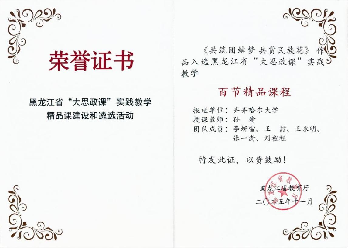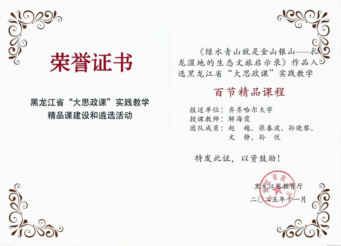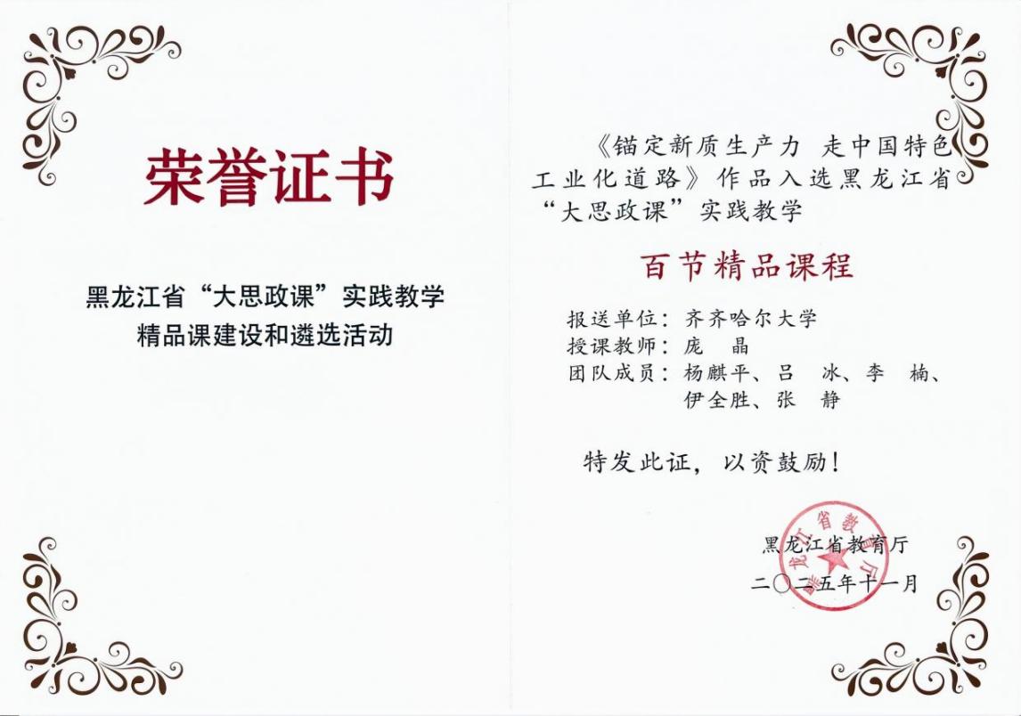 近日,黑龙江省教育厅开展“大思政课”实践教学精品课程建设和遴选工作。我校马克思主义学院教师精心打造的作品凭借扎实的教学功底,创新的实践设计,在全省各高校众多参评作品中脱颖而出,庞晶的《锚定新质生产力走中国特色工业化道路》、孙瑜的《共筑团结梦共赏民族花》、解海霞的《绿水青山就是金山银山——扎龙湿地的生态文旅启示录》和陈禹析的《江桥抗战——中国人民有组织武装抗日第一枪》课程,成功入选全省“大思政课”实践教学百节精品课程。我校入选数量居全省高校第三位,彰显了学校深耕思政课建设、赋能立德树人的扎实成效与创新实力。
