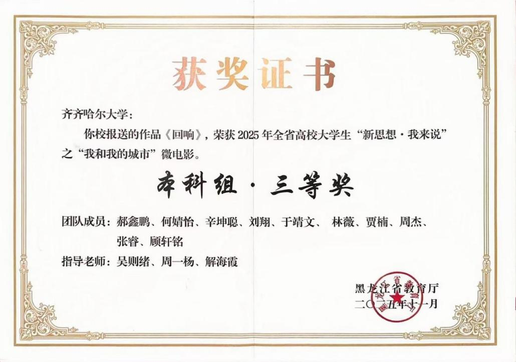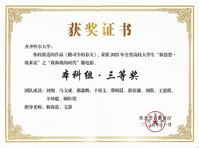 近日,由黑龙江省教育厅主办的2025年全省高校大学生“新思想·我来说”主题展示活动评选结果揭晓。我校选送的由解海霞、文静老师指导的作品《鹅司令的春天》荣获“我和我的时代”微电影本科组三等奖,由吴则绪、周一杨、解海霞老师指导的作品《回响》荣获“我和我的城市”微电影本科组三等奖,充分展现了我校思政育人成果与青年学子的青春风采。