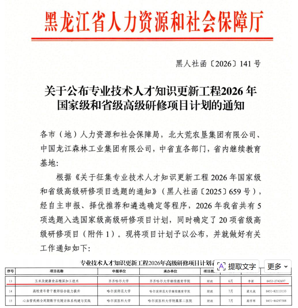 近日,黑龙江省人力资源和社会保障厅印发《关于公布专业技术人才知识更新工程2026年国家级和省级高级研修项目计划的通知》。我校由继续教育学院牵头、食品与生物工程学院申报的《玉米及健康食品精深加工技术》成功获批2026年省级高级研修项目。